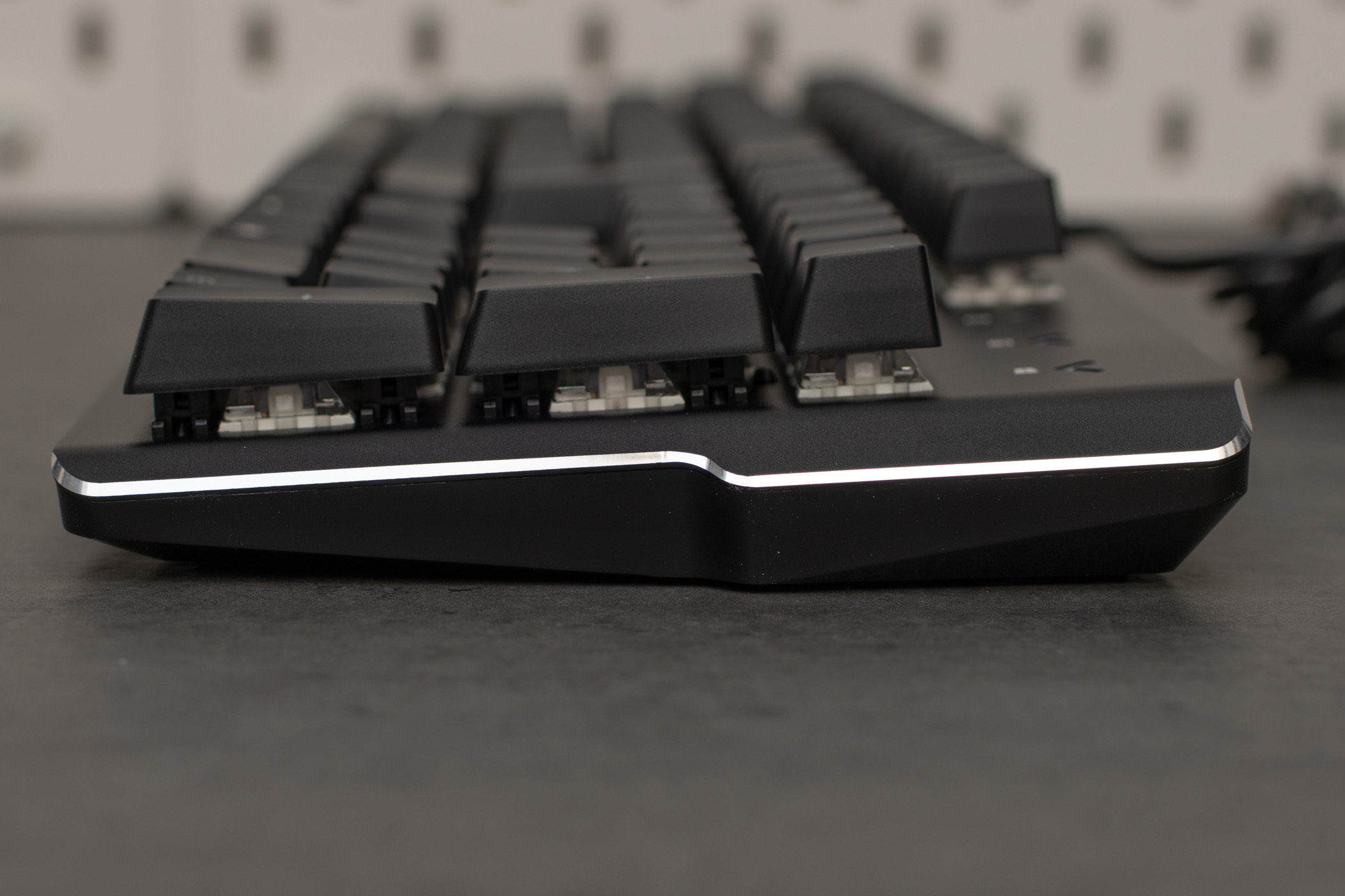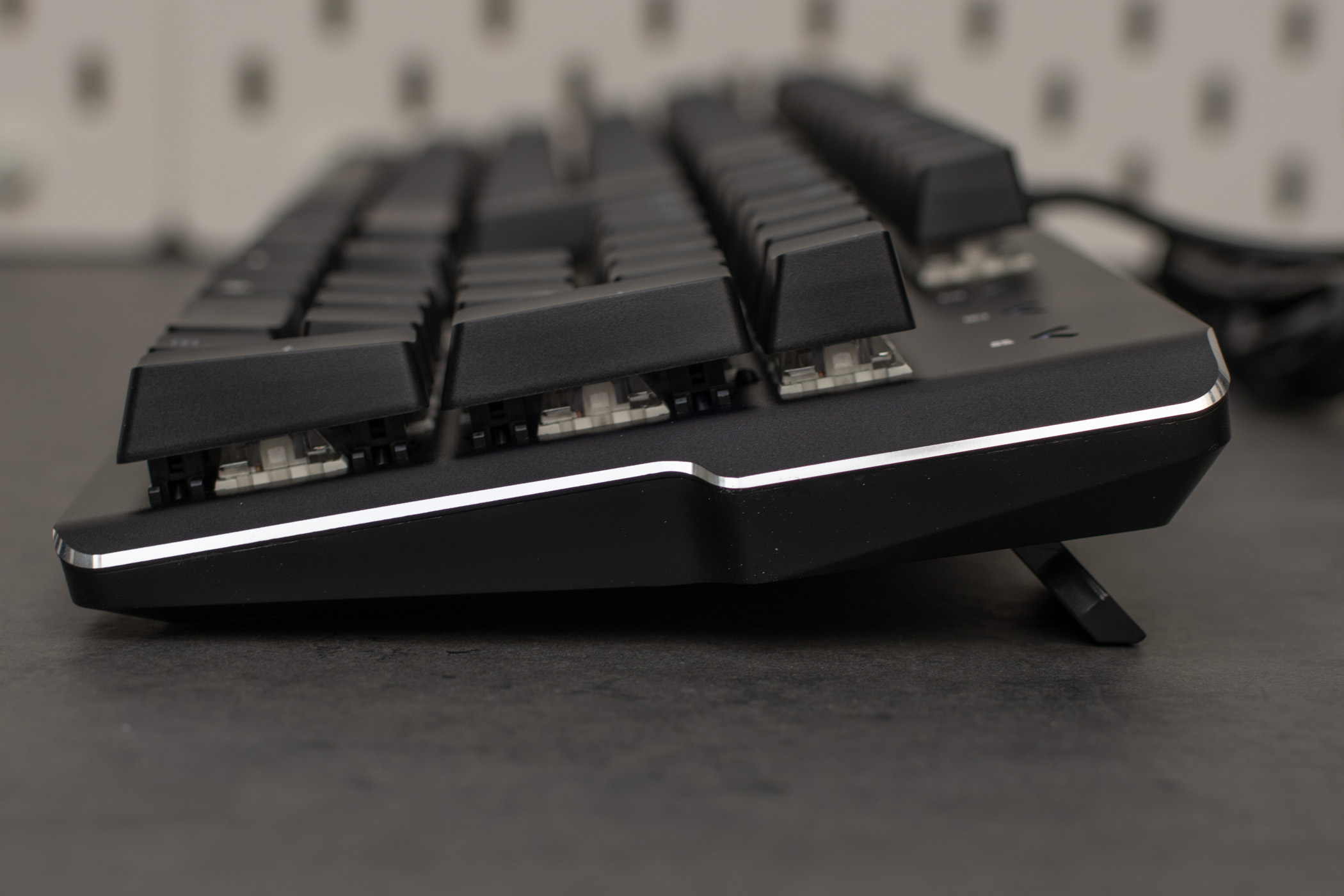 Das Tippgefühl der blauen Switches ist wie für diese Bauweise typisch mit einem leichten Widerstand und gleichzeitigem Klack-Geräusch. Da man so den Schaltpunkt erfühlen und auch hören kann bekommt man ein sehr gutes Feedback. Hat man zuvor eine Tastatur mit linearen Switches genutzt, muss man sich hier zunächst an den spürbaren Druckpunkt gewöhnen, kann dann aber schnell problemlos mit der Tastatur arbeiten und zocken. Allerdings darf man nicht vergessen, dass insbesondere, wenn sich weitere Personen in der Nähe befinden, das akustische Feedback der blauen Switches durchaus mal anstrengend werden kann. Als Anwender selber gewöhnt man sich recht schnell an die Geräusche. Ein bisschen erinnert das Tippen mit blauen Switches immer an mechanische Schreibmaschinen.