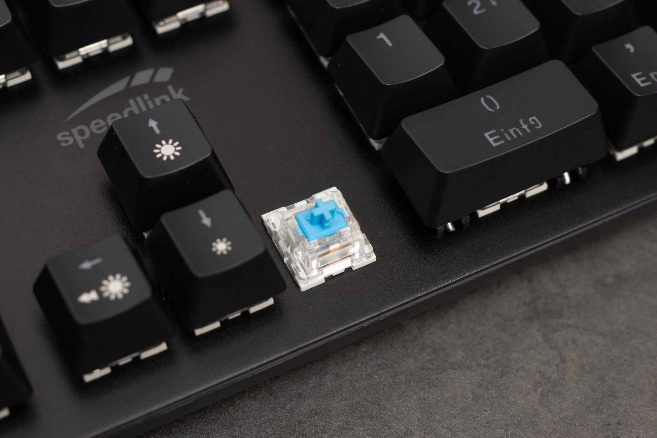Die Speedlink VELA LED ist eine mechanische Tastatur im klassischen Vollformat-Layout und setzt auf blaue, taktile Switches. Der Hersteller und die Lebensdauer der Switches wird nicht angegeben. Durch ein N-Key-Rollover sind auch aufwändige Tastenkombinationen kein Problem. Aber auch eine effektvolle Beleuchtung, die heute bei keiner Gaming-Tastatur mehr fehlen darf, ist integriert. Wie bei Speedlink üblich, sind die WASD-Tasten mit einem angedeuteten Steuerkreuz hervorgehoben. Für eine höhere Stabilität verfügt die Tastatur über eine Oberfläche aus Metall.