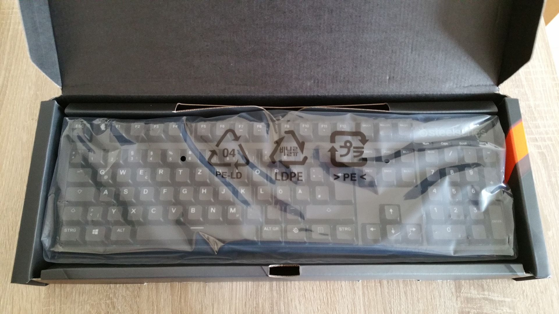 Die Tastatur kommt in einem schlichten Karton daher, welcher schön bedruckt ist, sowohl in Sachen Farbe und Kontrast, als auch mit Spezifikationen. Beim Öffnen des Kartons fällt das Keyboard sofort auf. Dies liegt geschützt in einer Plastikfolie damit nichts an die Tastatur herankommt. Hierunter befindet sich der Quick-Start-Guide, welcher den Plug n‘ Play Gebrauch näher beschreibt. Zudem findet sich hierin eine Webadresse, unter welcher der zukünftige Besitzer die entsprechende Software für das Keyboard herunterladen kann. Bei der Software handelt es sich um die SteelSeries Engine in Version 3. Mit dieser wird aktuelle Hardware angesprochen und kann konfiguriert werden.