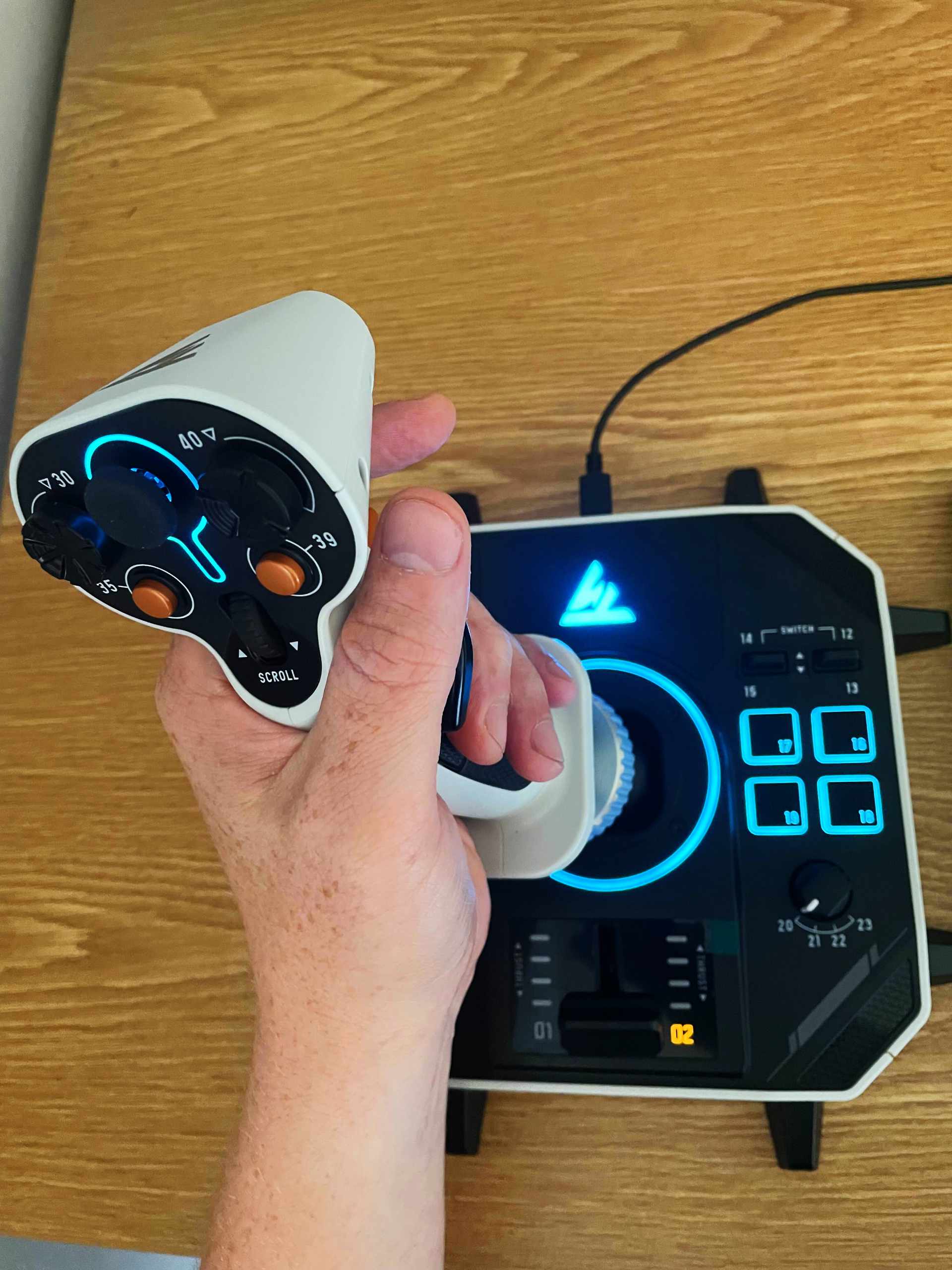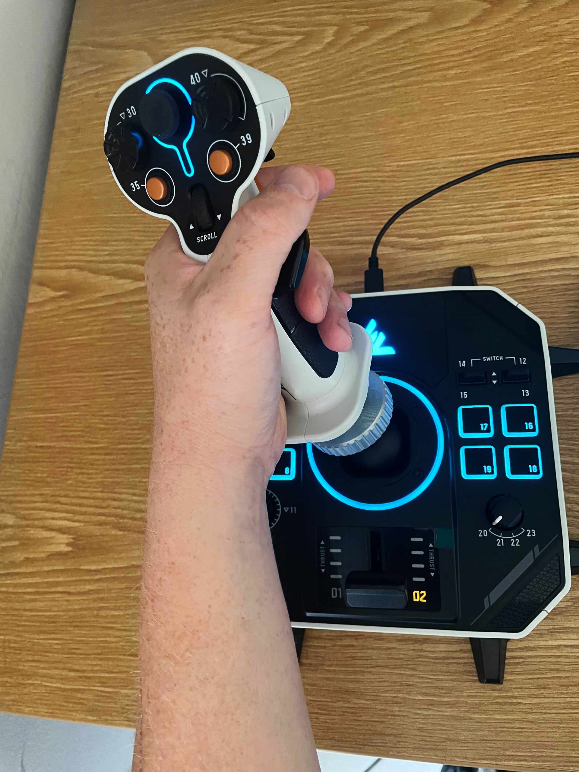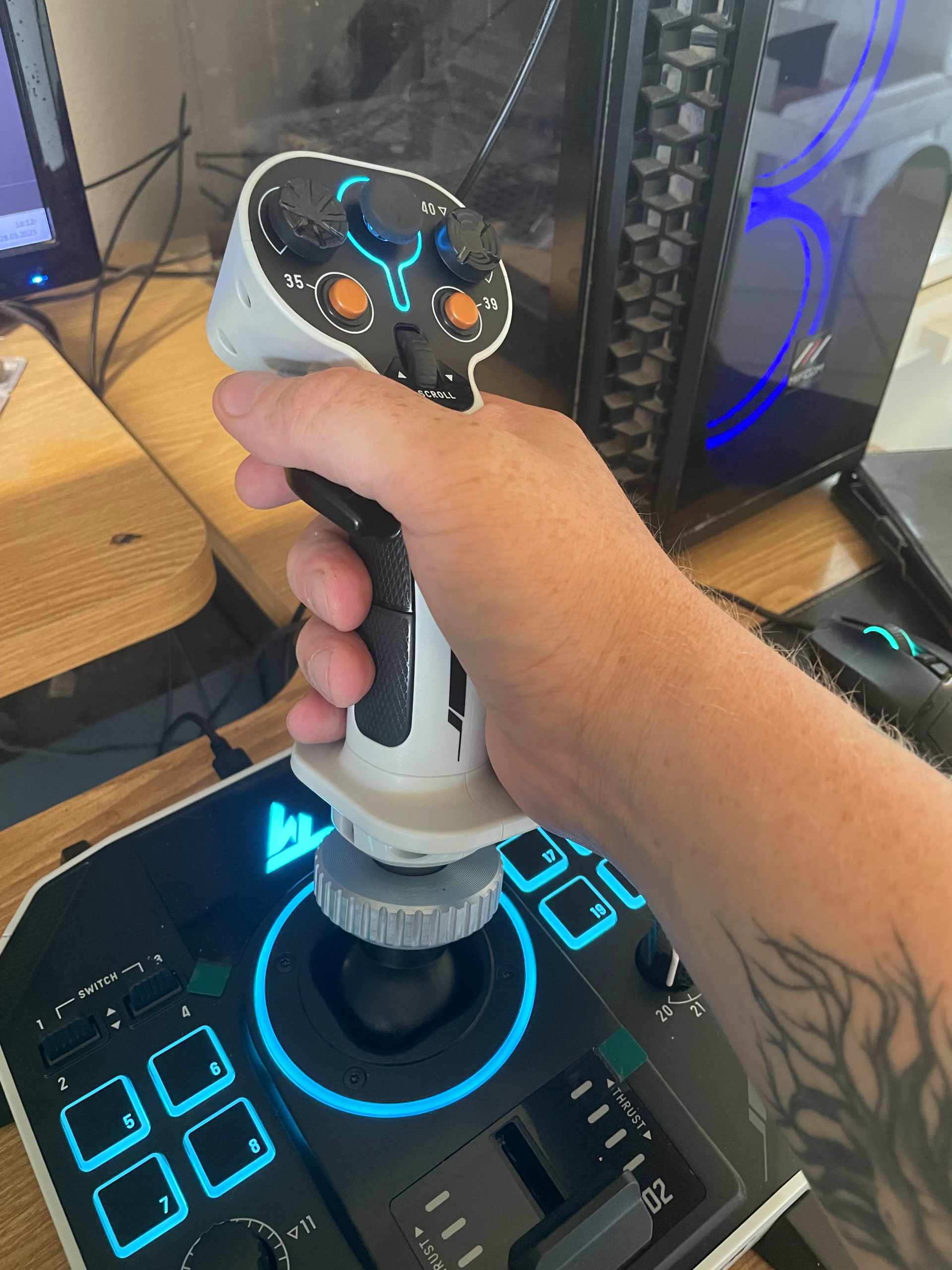 Im Inneren setzt Thrustmaster auf modernste Technik: Die neue HEART-Magnetsensor-Technologie mit 16-Bit-Auflösung sorgt für präzise Steuerung auf allen Achsen. Die Bewegungen fühlen sich weich und kontrolliert an, die Rückstellkräfte sind passend abgestimmt. Im Vergleich zu meinen jetzigen VKB Sticks sind jedoch die Pitch & Yaw Wege merklich länger. Dies sollte jedoch unter keinen Umständen als Nachteil gewertet werden.