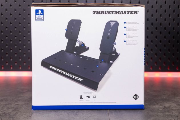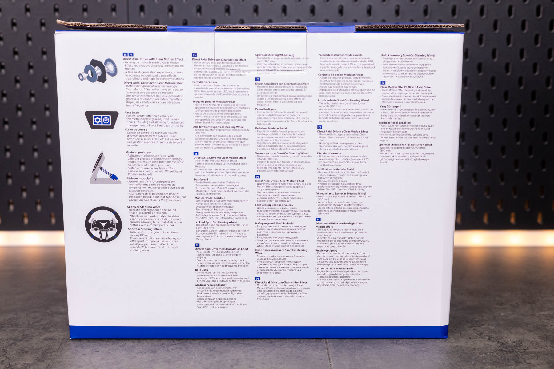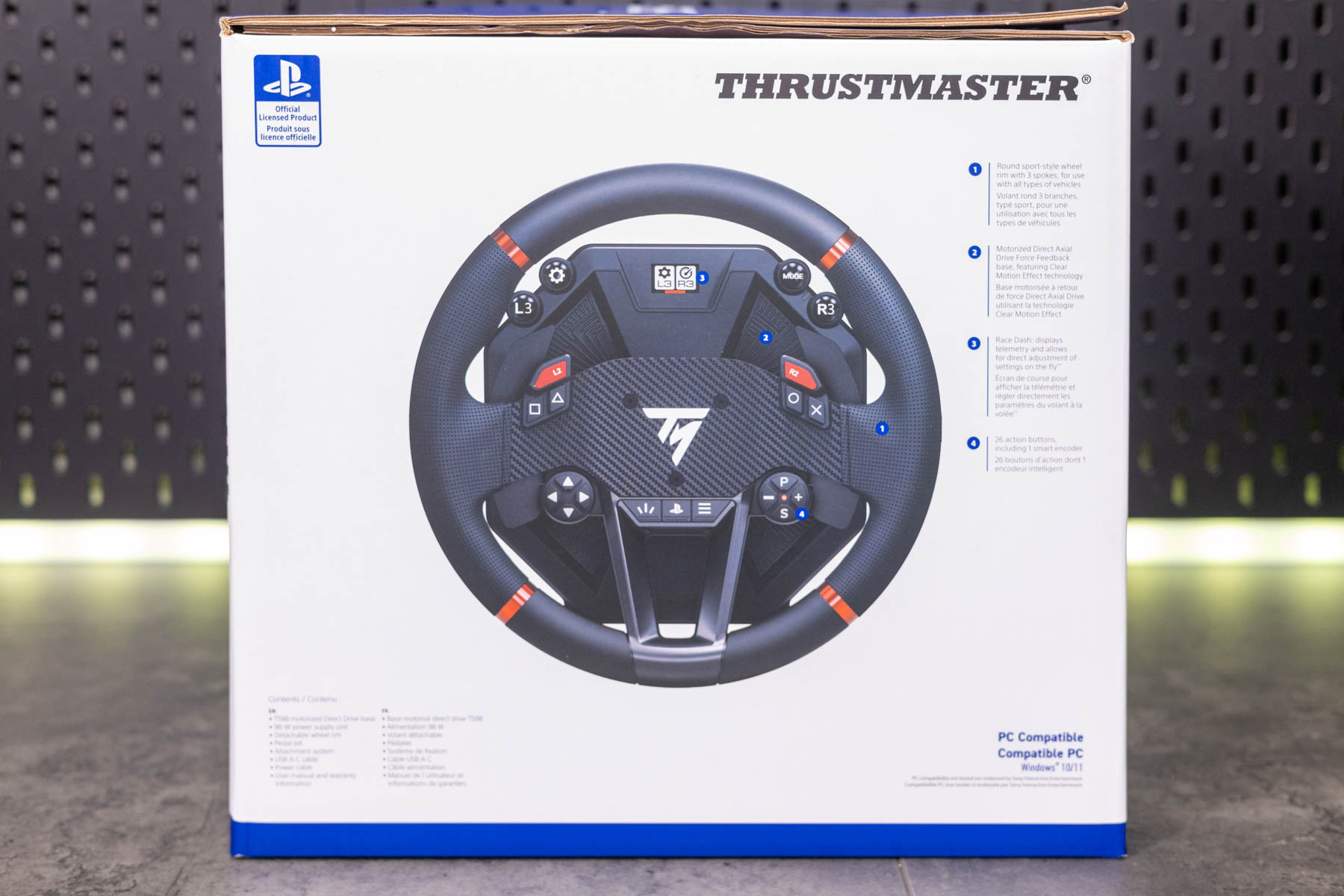 Die PlayStation-Kompatibilität des Thrustmaster T598 ist an der Umverpackung direkt zu erkennen. Der Hintergrund ist fast vollständig in Weiß gehalten und wird mit blauen Akzenten versehen. Auf der Vorder- und Rückseite finden sich zwei Abbildungen vom Rennlenkrad und der Kombination aus Rennlenkrad und Basis. Eine weitere Seite zeigt eine Abbildung der Pedalerie. Ringsum finden sich zudem weitere Detailinformationen zu den technischen Daten.