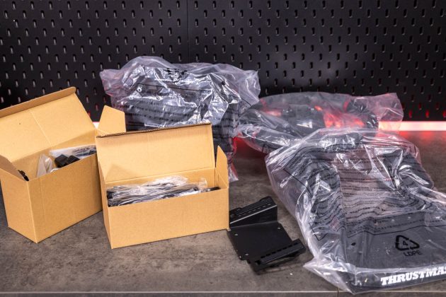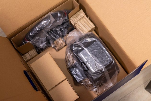 Alle Komponenten sind im Inneren gut ineinander verschachtelt und werden durch Kartonagen und Folienbeutel geschützt. Der Lieferumfang besteht neben der Basis, dem Lenkrad und den Pedalen noch aus einer Tischklemme, dem Netzteil, den Verbindungskabeln und weiteren Federn zur individuellen Abstimmung der Pedale.