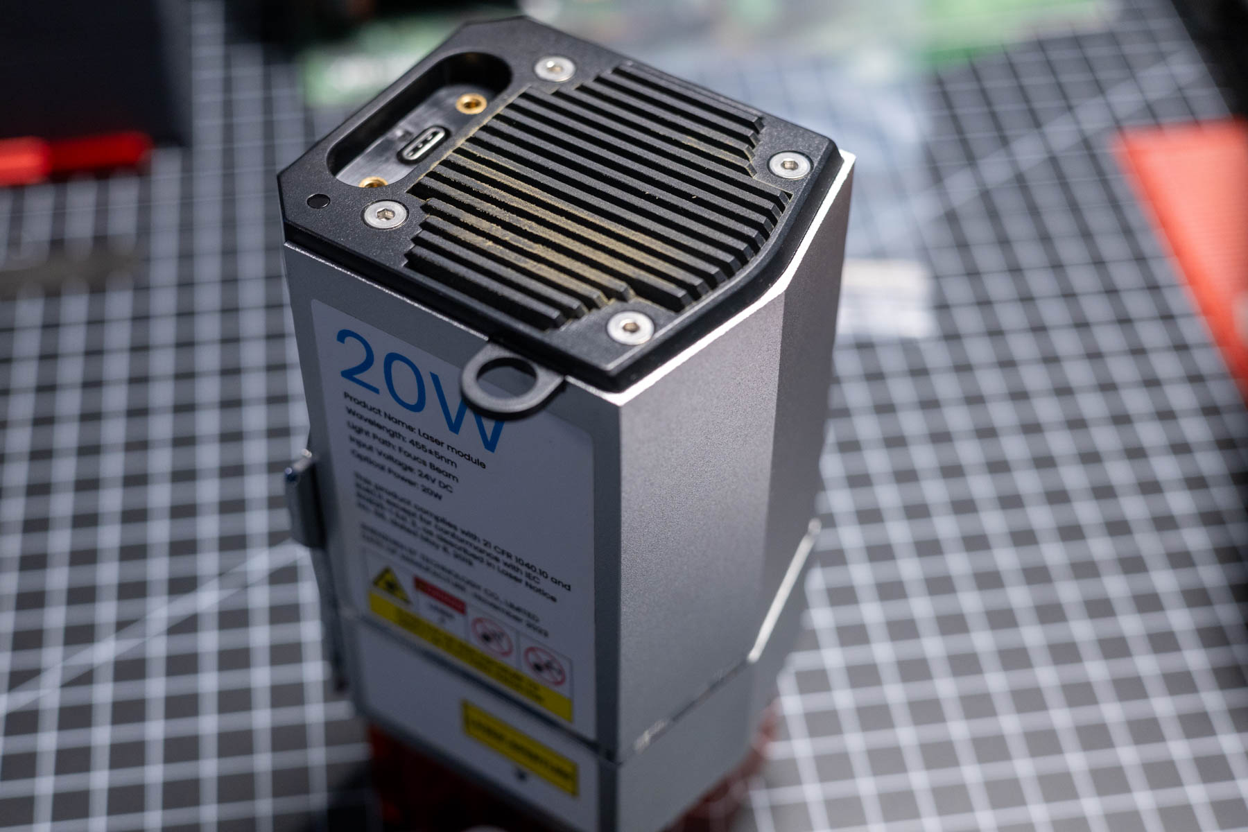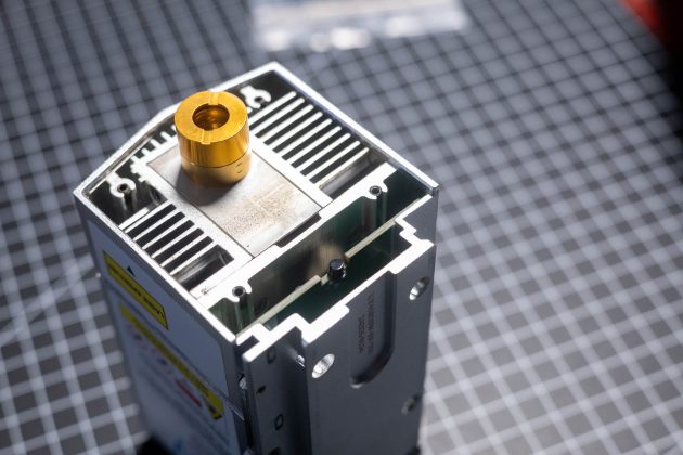 Nachdem wir den TOOCAA L2 im Rahmen der Review mehrere Stunden in Betrieb hatten, haben wir uns insbesondere einmal das Lasermodul für eine Reinigung vorgenommen. Zu unserer Überraschung haben wir festgestellt, dass die Linse komplett sauber war. Es gab lediglich etwas Staub am oberen Lüftergitter und an den Kanten des Sichtschutzes. Um an die Linse zu gelangen, muss man lediglich eine kleine Madenschraube lösen, um die Luftführung des Air-Assist-Systems abzunehmen.