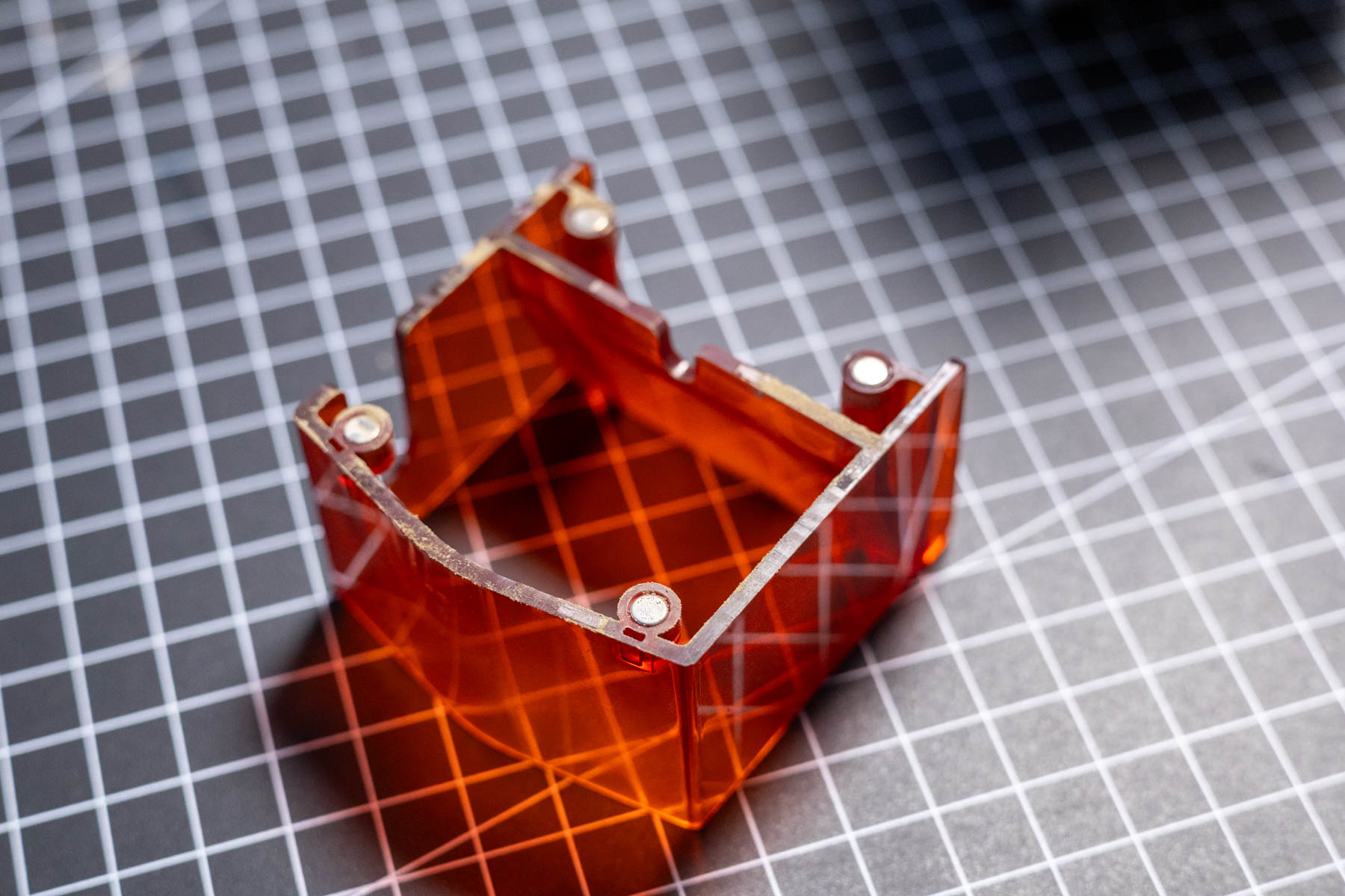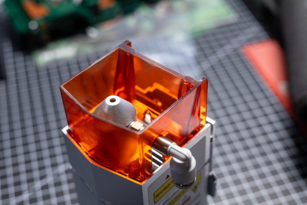 Bei der Arbeit mit einem Lasergravierer trägt man häufig einen Teil der Materialoberfläche ab, oder es kommt durch die Erhitzung zu einer Rauch- und Rußentwicklung. Das Air-Assist-System hält hier schon einen ganzen Teil der Stäube davon ab, sich auf der Linse niederzuschlagen, dennoch sollte diese regelmäßig gereinigt werden. Zudem sammeln sich die Stäube auch im Gehäuse des Lasers und sind hier mehr als einfach nur Dreck. Denn mit zunehmender Staubmenge stellt dieser eine echte Brandlast dar. Daher ist es erforderlich, den Innenraum ebenso regelmäßig zu reinigen, wie das Lasermodul. Durch die Klemmhaltung an der Schwalbenschwanzführung ist das Lasermodul schnell demontiert, man muss vorher lediglich das USB-C-Kabel abziehen und den Luftschlauch des Air-Assist-Systems lösen. Für die Reinigung des Innenraums empfiehlt sich ein Mikrofasertuch. Die Aluminiumelemente lassen sich feucht oder mit Isopropanol gut reinigen, für das Acrylglas gibt es besondere antistatische Reiniger.