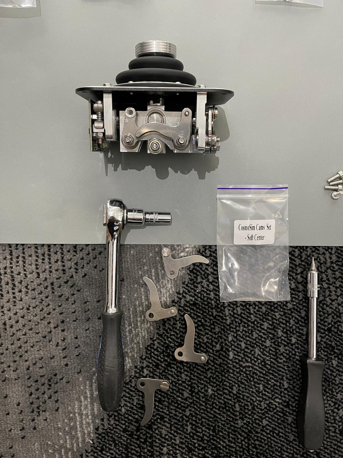 Einen Tipp, den wir selbst dankenswerterweise erhalten und bis heute auch nutzen, ist der Einsatz der Cosmo Cams in der Variante Soft Center für die linke Base in der Achse vor und zurück. Dies hat den Effekt, auch im hektischen Flug-Kampf leicht spüren zu können, ob der Stick den Übergang von vorwärts zu rückwärts und umgekehrt passiert hat. Anfühlen tut sich das wie bei einem Kugelraster.