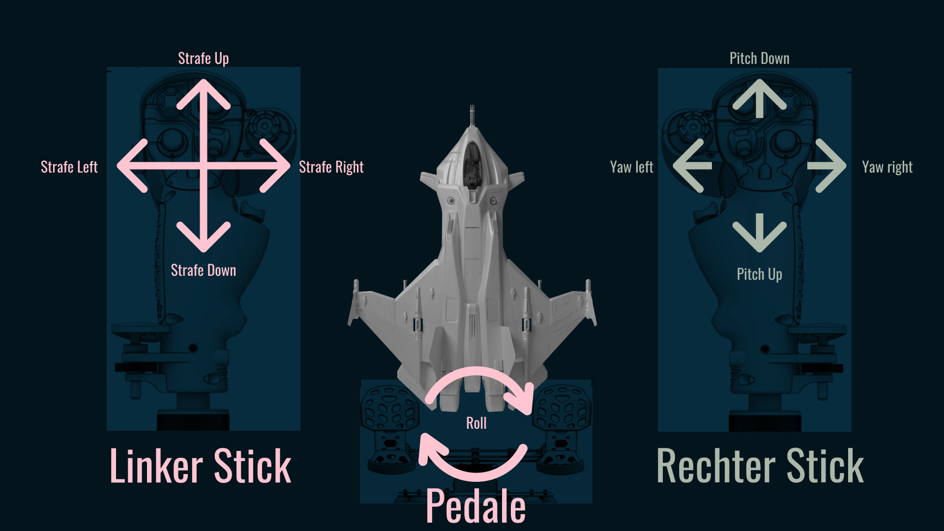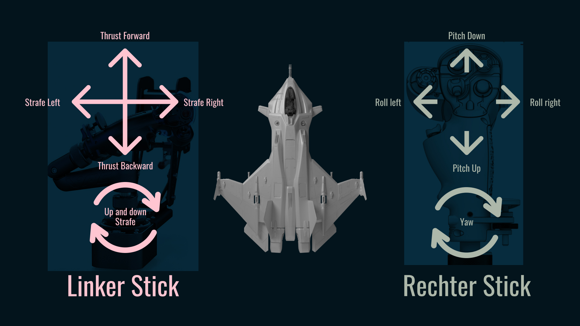 Der linke Stick sollte in erster Linie für die Bewegung und allgemeine Systeme des Raumschiffs genutzt werden. Hier einige wichtige Funktionen, die auf den linken Stick gehören: