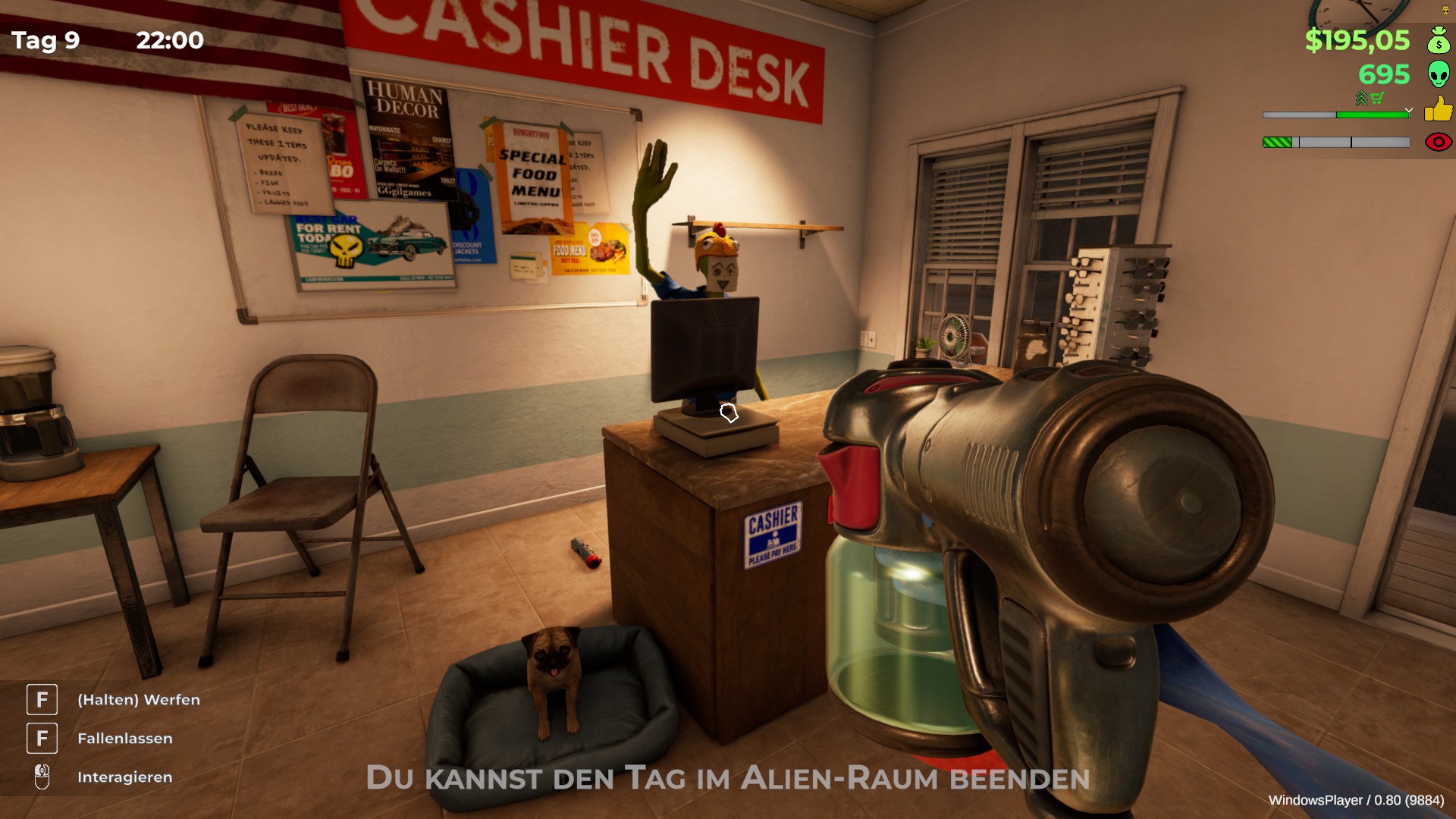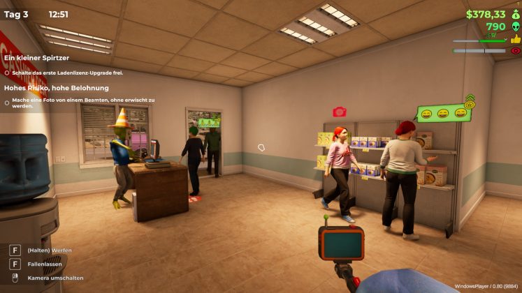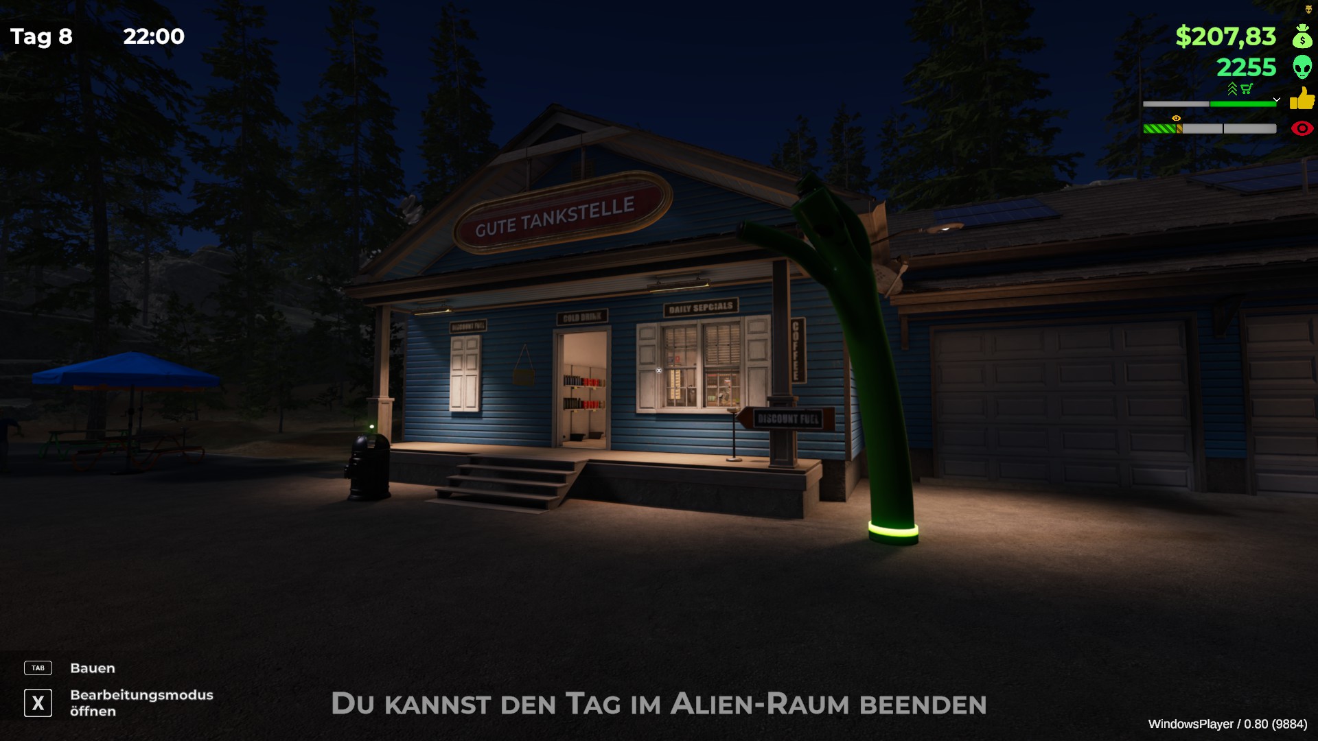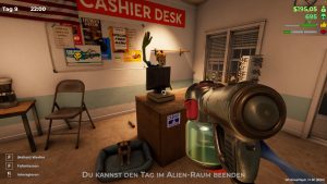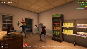 Haben wir unser Alien erstellt und den Namen unserer Tankstelle gewählt, kann es auch schon losgehen. Zu Beginn gleicht das Gameplay hier dem eines jeden anderen Laden-Simulators: Wir kaufen Regale und Waren, platzieren diese in der Tankstelle und bestimmen ihre Preise.