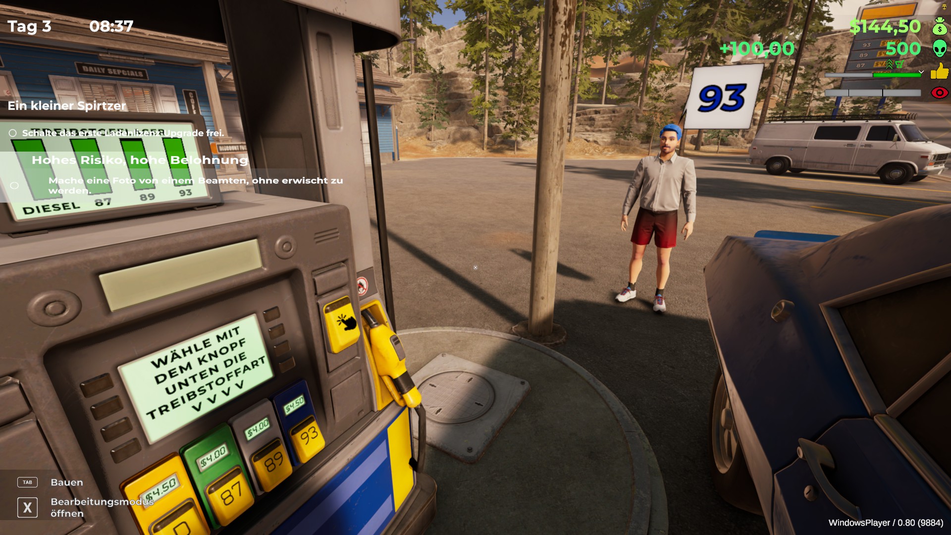 Sobald wir den Laden eröffnen, strömen NPCs hinein, kaufen unser Inventar auf und müssen an der Kasse entsprechend abkassiert werden. Parallel parken immer wieder Autos an unserer Zapfsäule, die betankt und ebenfalls abkassiert werden müssen.