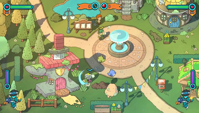Besonders cool fanden wir den Couch-Koop. Richtig gehört: The Swords of Ditto lässt sich zu zweit spielen. Und frei nach dem Motto double the gun – double the fun macht das RPG im Multiplayer eine richtig gute Figur. Man kann Taktiken gegen starke Gegner ausprobieren und auch die Kombination verschiedener Items und/oder Waffen kommt so richtig klasse zur Geltung. Einzelne Rätselpassagen in Dungeons, vorzugsweise getimte Sprünge, sind jedoch ein wenig knifflig. Geht einem der beiden Helden die Lebensenergie aus, kann der andere ihn direkt wiederbeleben, was allerdings dann auf Kosten der eigenen Gesundheit geht. Diese ist im Spiel rar gesäht, also sollte man schon etwas auf der Hut sein und nicht zu ungestüm vorgehen.