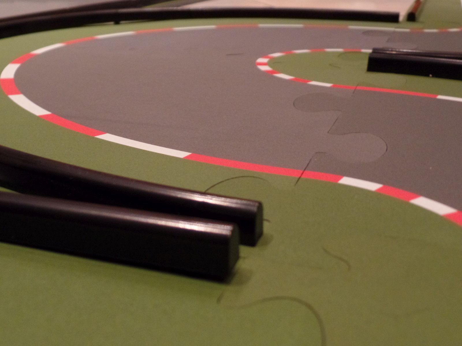 Hat man dann seinen Rundkurs zusammen, steckt man am Rand der Platte die schwarzen Leitplanken ein, damit die Autos nicht ungewollt von der Strecke brausen. Dazu befinden sich an den Fahrbahnplatten passende Löcher, in die die Planken dann gesteckt werden. Wer möchte, kann diese auch auf der Unterseite mit einem roten Stecker fixieren, wodurch die Planken dann erdbebensicher an ihrem Platz verweilen. Rein aus der Praxis heraus können wir sagen, dass die Planken auch ohne diese Fixierung halten und man sie am Ende des Spieltags auch wieder leichter entfernen kann. Dadurch wird das gesamte System etwas portabler, da die Streckenteile ohne Planken weniger Stauplatz in Anspruch nehmen. Nachteil könnte auf die lange Sicht sein, dass die Stecklöcher mit Zeit etwas ausleiern und die Planken locker sitzen könnten.