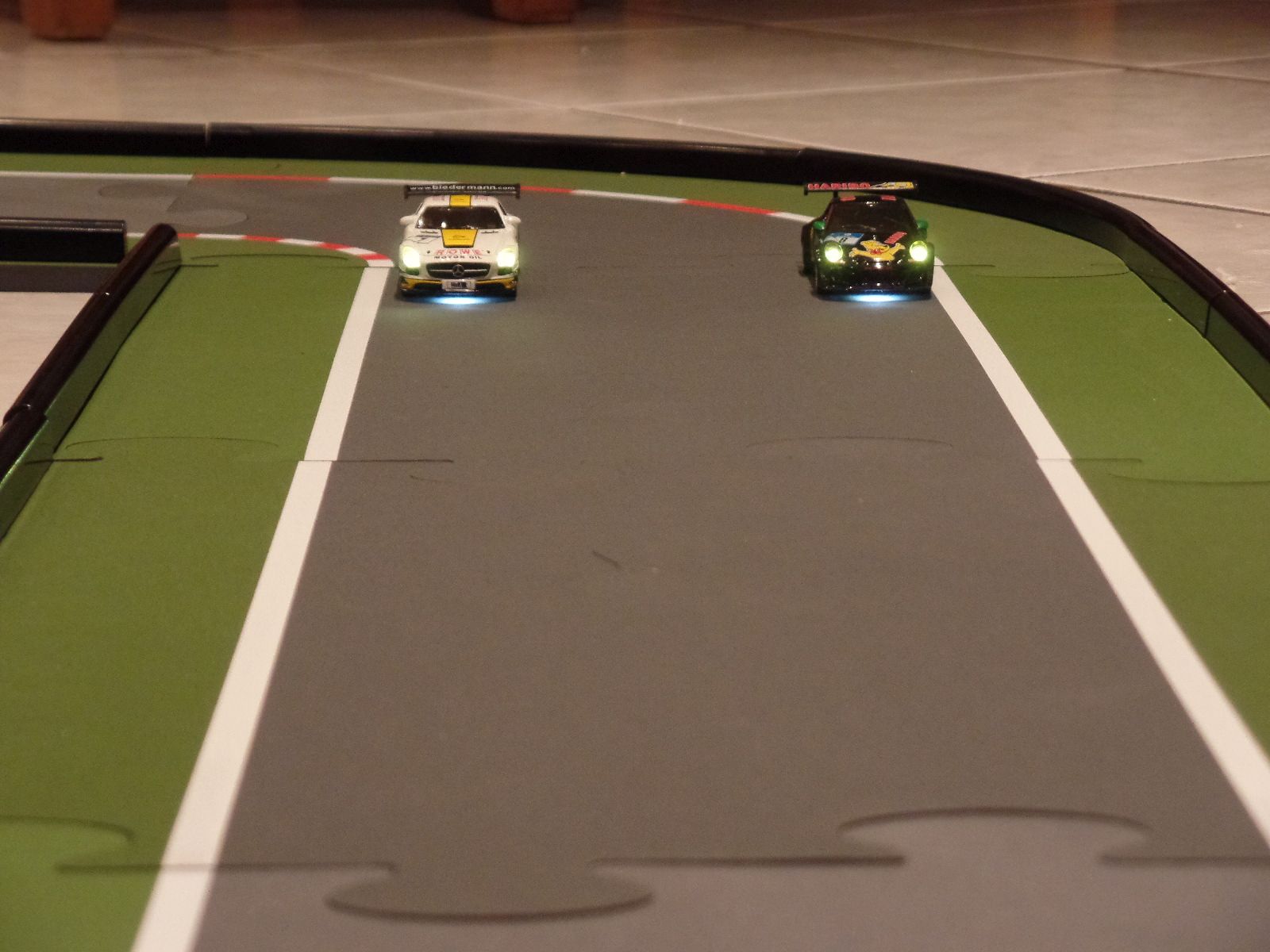 Die Bahn ist gebaut, die Akkus geladen und die Fernbedienungen in den Händen. Fehlt eigentlich nur noch das grüne Licht und schon geht es ab. Bevor man sein Rennen startet, sollte man die Fahrzeuge kalibrieren. Mittels Steuereinheit können die Vorderräder feinjustiert werden, so dass sie auch geradeaus fahren und nicht zu einer Seite hin abdriften.