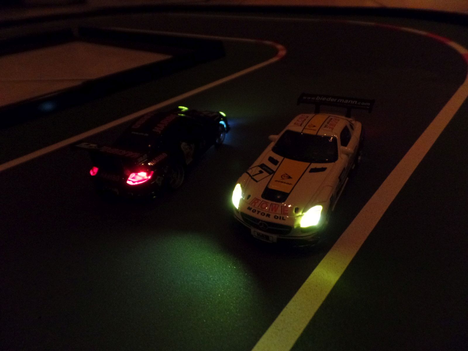 Die Rennautos von SIKU besitzen die Besonderheit eines Lichtsensors an der unteren Schnauze. Den kann man wahlweise zu- oder abschalten, aber wenn ihr die Features erst einmal in Aktion erlebt habt, dann werdet ihr ihn ohnehin nicht wieder deaktivieren. Dieser Lichtsensor scannt nämlich permanent den Untergrund, auf dem sich das Fahrzeug bewegt und reagiert entsprechend. Das sieht dann in etwa so aus:
