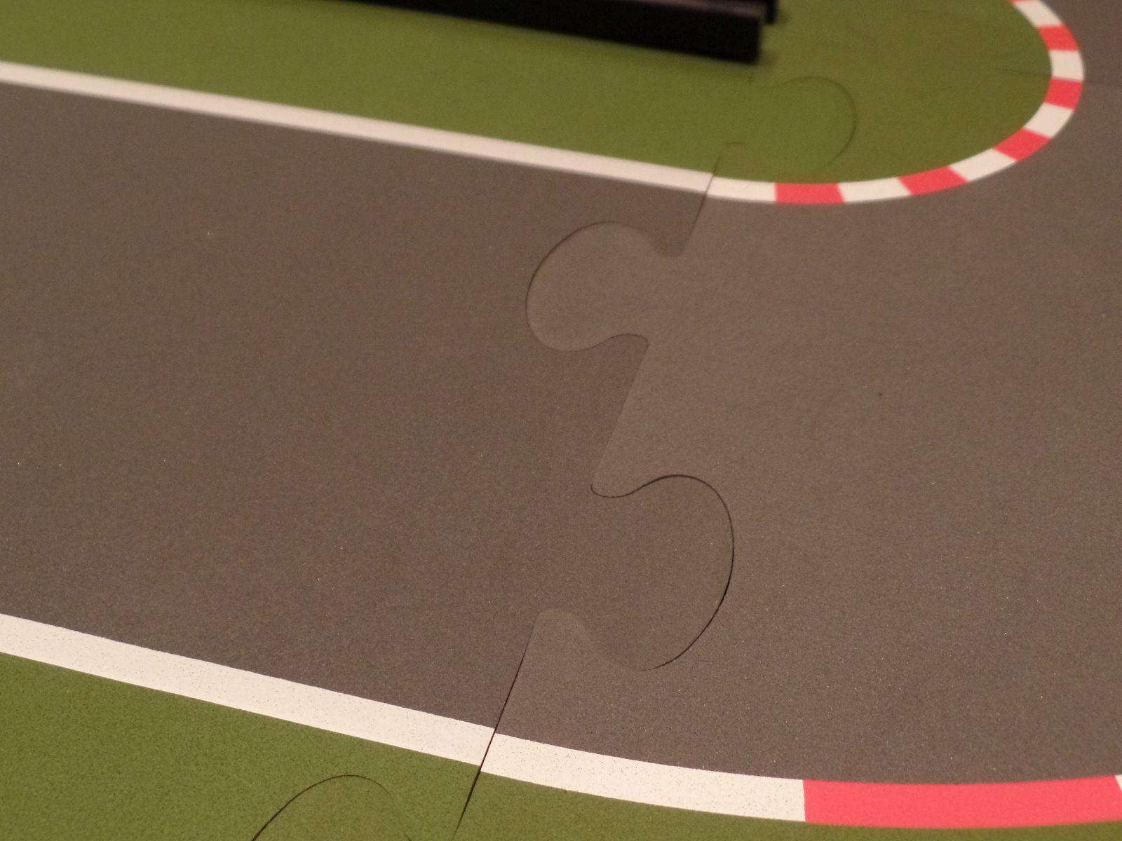 Grau und Grün sind die beiden Farbbestandteile der Bahn, auch alle einheitlich im gleichen Material gehalten. Die Pfützen und Beschleunigungsstreifen kann man bei Bedarf auf die Fahrbahn legen, um dem Rennen etwas mehr Kick zu verleihen. Hier werden sanfte Gefühle an ein Mario Kart geweckt. Die Sensoren funktionieren absolut perfekt und man merkt die Auswirkungen auf das Fahrverhalten sehr unmittelbar. Besonders die Pfützen können ein unberechenbarer Faktor in einem Rennen werden, in einer Kurve platziert sogar doppelt.