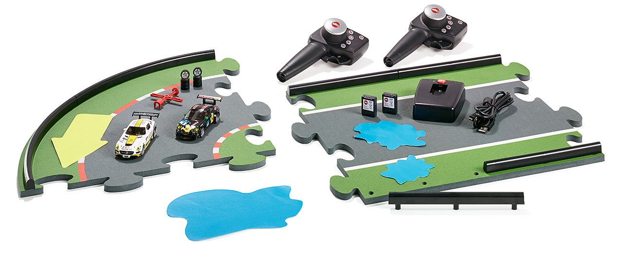 [quote]Das ist der Beginn einer neuen Motorsport-Leidenschaft für jedes Alter! Mit diesem Startset von SIKUracing wird die klassische Rennbahn revolutioniert: Spurungebunden, effektvoll, authentisch, so können der Porsche 911 GT3 R und der Mercedes-Benz SLS AMG GT3 auf die Strecke geschickt werden. Zum Startset gehören die beiden Race-Cars mit verlässlicher Pistolen-Handsteuerung ebenso dazu wie die je 8x Fahrbahnteile, die leicht und robust zusammengesteckt und mit seitlichen Leitplanken versehen werden können. Vom Start an geht es um ein rasantes Rennvergnügen wie auf den großen Rennstrecken! Wer vom Kurs abkommt, erlebt am Spurverhalten, wie er sein Fahrzeug wieder auf Kurs bringen muss, ein Farbsensor im Fahrgestell macht das innovative Rennbahn-Flair spektakulär erlebbar. Die Fahrzeuge mit robuster Zinkdruckguss-Karosserie sind mit innovativer 2,4 GHz Funktechnik und proportionaler Lenkung ausgestattet. Zum Lieferumfang gehören Akkus und Ladegerät, die den Komplettbetrieb des neuen Spielsystems abrunden.[/quote]