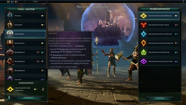 Spielerisch bleibt das Fundament von Age of Wonders 4 auch in Archon Prophecy unverändert, doch die Erweiterung bringt frische Inhalte, die für noch mehr taktische Möglichkeiten sorgen. Neben den beiden neuen spielbaren Völkern, eröffnet die Kultur der „Architekten“ neue Wege: Als Meister der Baukunst errichten sie monumentale, magische Bauwerke, die einer von dir gewählten Affinität gewidmet werden können. Dadurch wird nicht nur die eigene Wirtschaft angekurbelt, sondern man schaltet auch mächtige Boni frei.