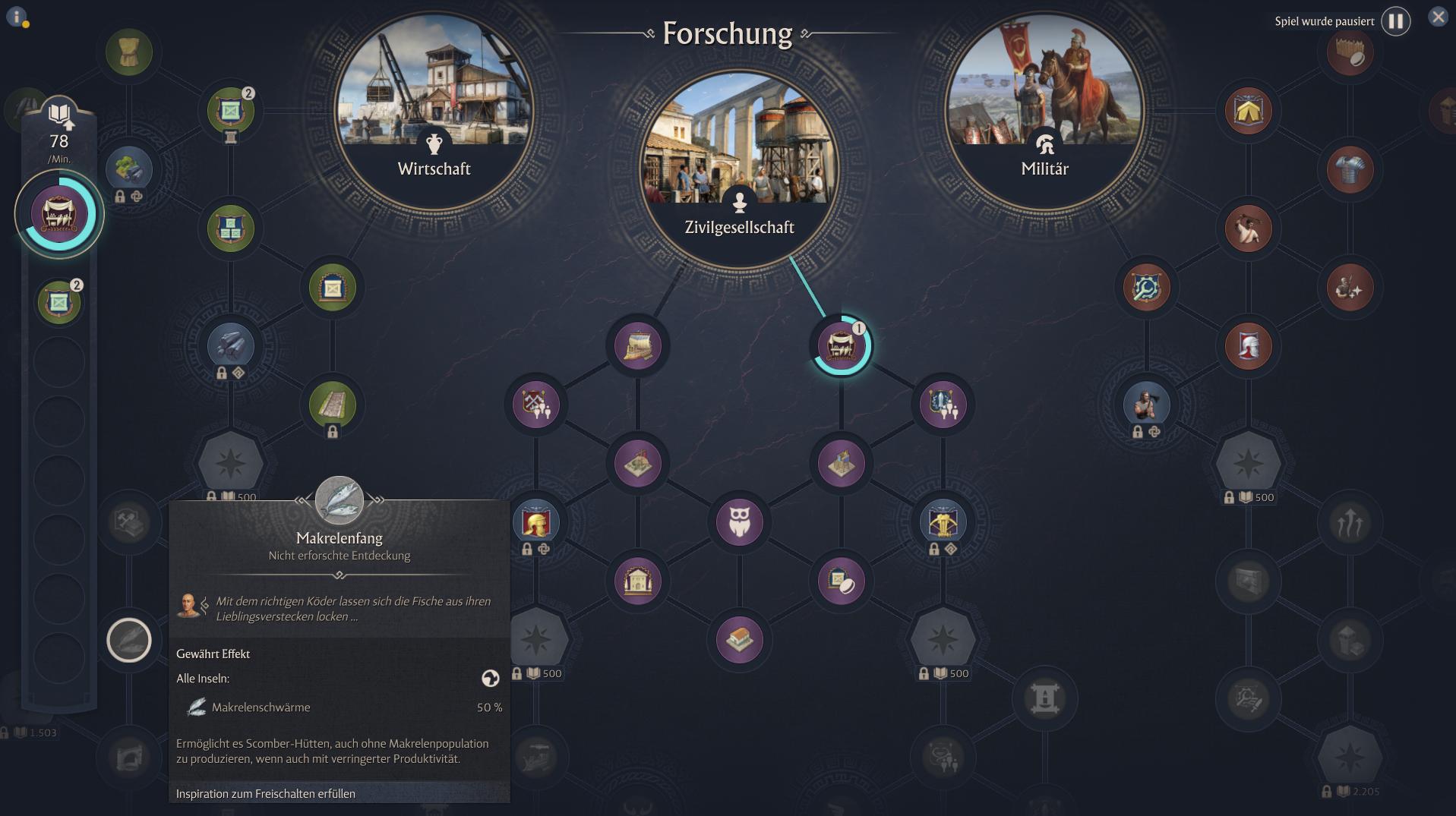 Eine weitere Neuerung ist der Einfluss von Religion. Jede bevölkerte Insel kann ihren eigenen Patron wählen. Auch hier sollte die Wahl zwischen Neptun, Ceres und anderen weise ausfallen. Jeder der sieben Patronen gibt der Insel und ihrer Wirtschaft andere Buffs. Nicht jede Gottheit steht von Beginn an zur Verfügung, was uns zu einer weiteren Veränderung bringt. Über einen Wissensbaum können neue Technologien, Erweiterungen oder Gottheiten freigeschalten werden, sofern dem Volk die entsprechenden Einrichtungen zur Verfügung stehen. Jede Forschung benötigt Zeit und zum Teil bestimmte Anforderungen. Diese sind in die Themen Wirtschaft, Zivilgesellschaft und Militär eingestuft und haben damit auch einen strategischen Einfluss auf die Spielwelt.