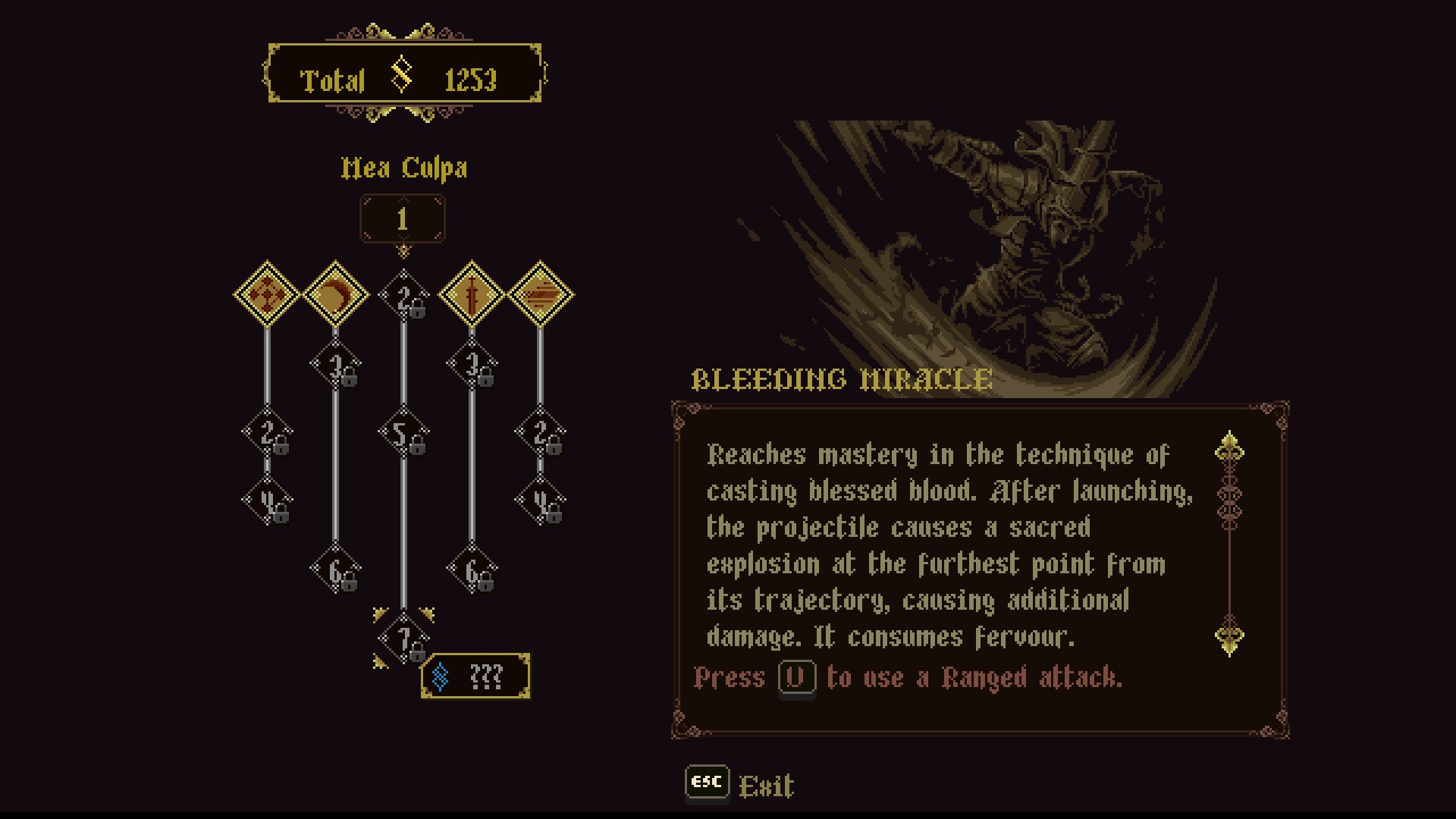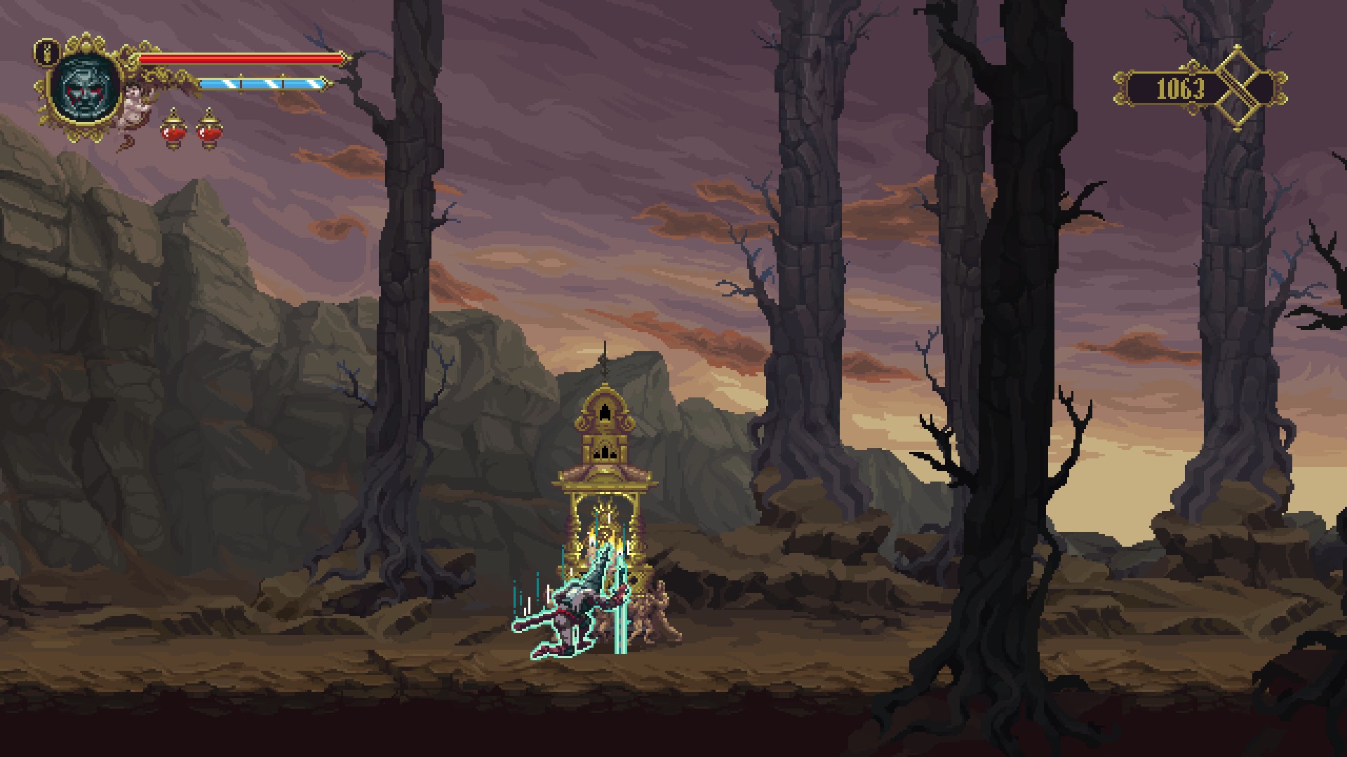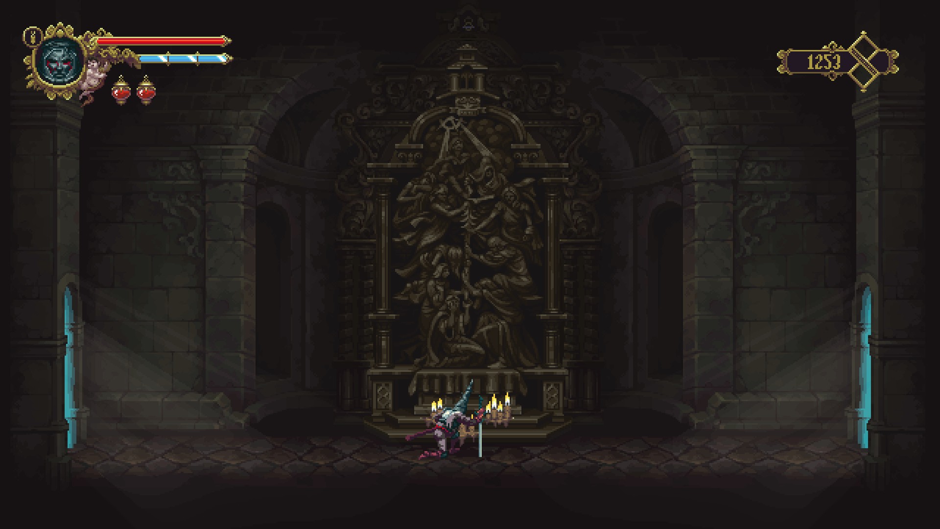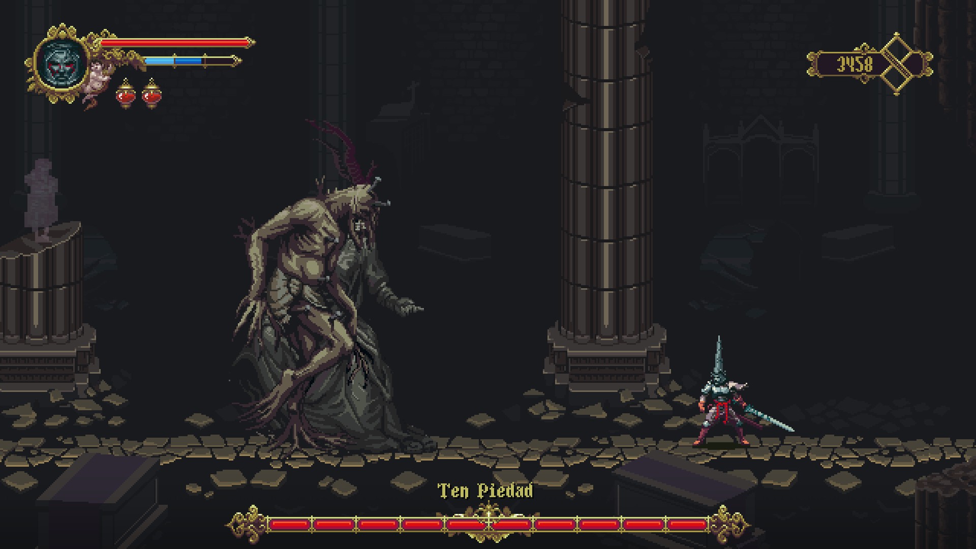 Blasphemous ist einfach gesagt ein 16-Bit Soulslike-Metroidvania-2D-Plattformer. Das Gameplay ist recht schnell und es steuert sich sehr präzise und direkt. Als dauerhaften Begleiter haben wir Mea Culpa, unser Schwert, das während des Spielverlaufs immer stärker wird. D.h., dass nicht unser Held Level für Level aufsteigt, sondern Mea Culpa. Je höher das Level, desto mehr Angriffe können wir mit Tränen der Sühne (Tears of Atonement; entspricht der Währung) freischalten. Außerdem ist es möglich Mea Culpa mit passiven Items zu verstärken.