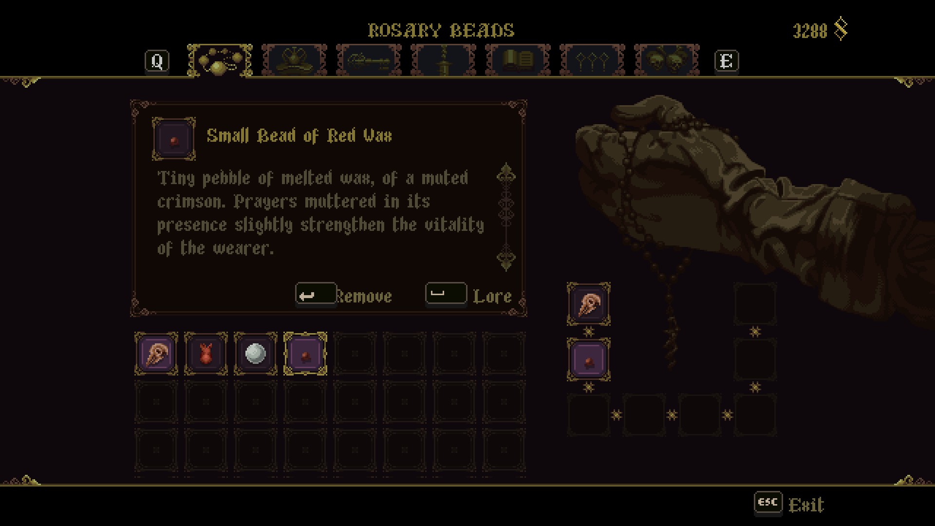 Neben den Gebeten gibt es auch, wie schon angedeutet, Items mit passiven Eigenschaften. Dazu gehören zum einen Perlen für unseren Rosenkranz, die dann zum Beispiel unsere Vitalität erhöhen oder Reliquien. Letztere bieten die Möglichkeit „die Welt mit anderen Augen zu sehen“ und eröffnen uns neue Wege in den Levels, Stichwort Backtracking.