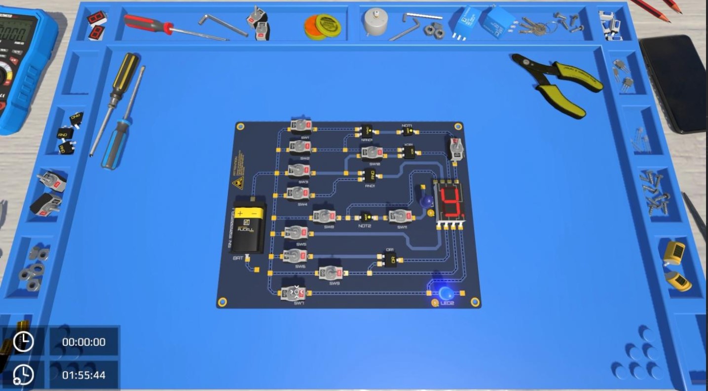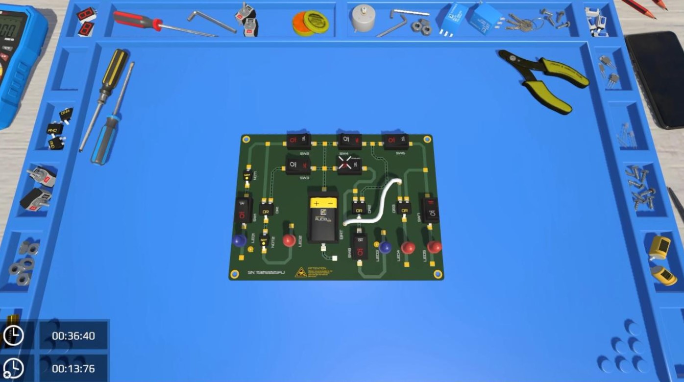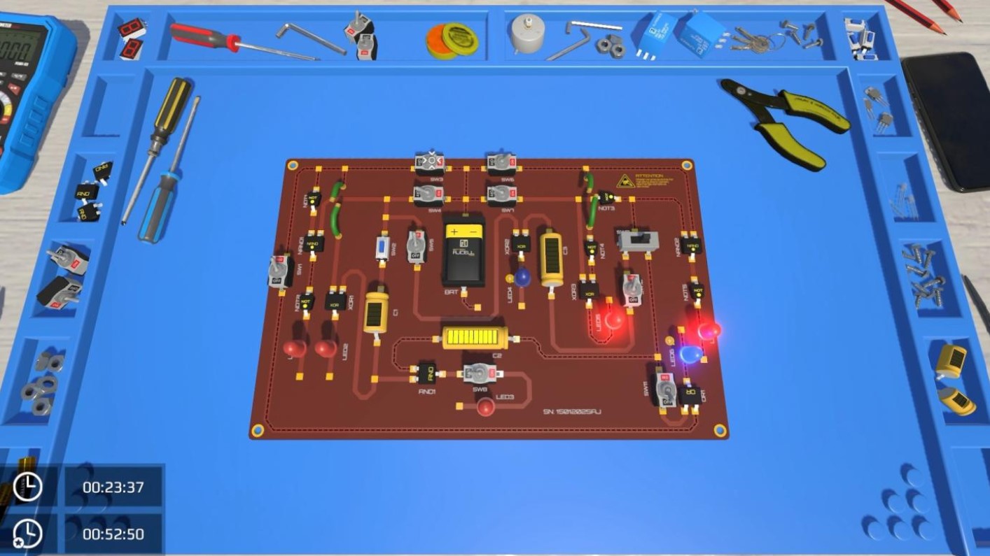 Insgesamt ist die grafische Darstellung zwar einfach, aber klar gehalten. Die einzelnen Komponenten sind recht gut erkennbar, wenngleich die Gesamtdarstellung einige Fragen aufwirft. Kaum zu erklären ist hierbei, warum die jeweilige Platine auf einem riesigen Tisch liegt, der sonst keinerlei Funktionen bereit hält. Die dort gezeigten Werkzeuge sind nämlich komplett funktionslos und nur Zierrat. Spätestens wenn die Platinen voller werden, könnte die Zoom-Funktion interessant sein. Jedoch könnt Ihr nur ein kleines Stückchen an die Platine heranzoomen. Gerade im Handheldmodus der Nintendo Switch ist das letztlich überhaupt nicht hilfreich.