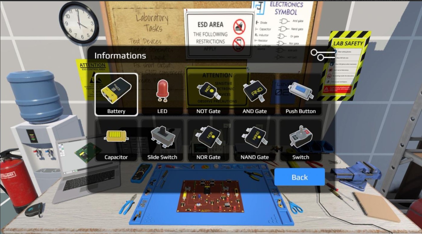 Bereits der Hauftungsausschluss auf dem Titelbildschirm verrät, dass es sich nicht um eine Simulation handelt, sondern eine „für jeden zugängliche, vereinfachte Version“. Tatsächlich bekommt Ihr eine kurze Erklärung der Bauteile und könnt auch schon die ersten Versuche auf den virtuellen Platinen starten.