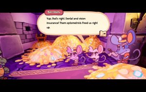 Spielerisch verpackt Escape from Ever After seinen märchenhaften Kampf gegen Konzerne in einem charmanten Turn-Based-RPG. Dabei erwartet einen jedoch nicht nur die Hauptgeschichte, sondern auch zahlreiche kleinere und größere Nebenquests – wie etwa gleich zu Beginn, wenn Flynt dabei helfen soll, für Pinocchio eine Geburtstagsfeier zu planen. Dazu muss er zunächst mit der offiziellen Vorsitzenden des Partyplanungs-Komitees von Ever After Inc. sprechen, die ihn damit beauftragt, Dekorationen, Torte und Co. zu besorgen. Dadurch lernen wir zugleich die umfunktionierten Bereiche von Tinders Schloss kennen.Generell werden sowohl Haupt- als auch Nebengeschichten mit viel Witz und Charme erzählt.