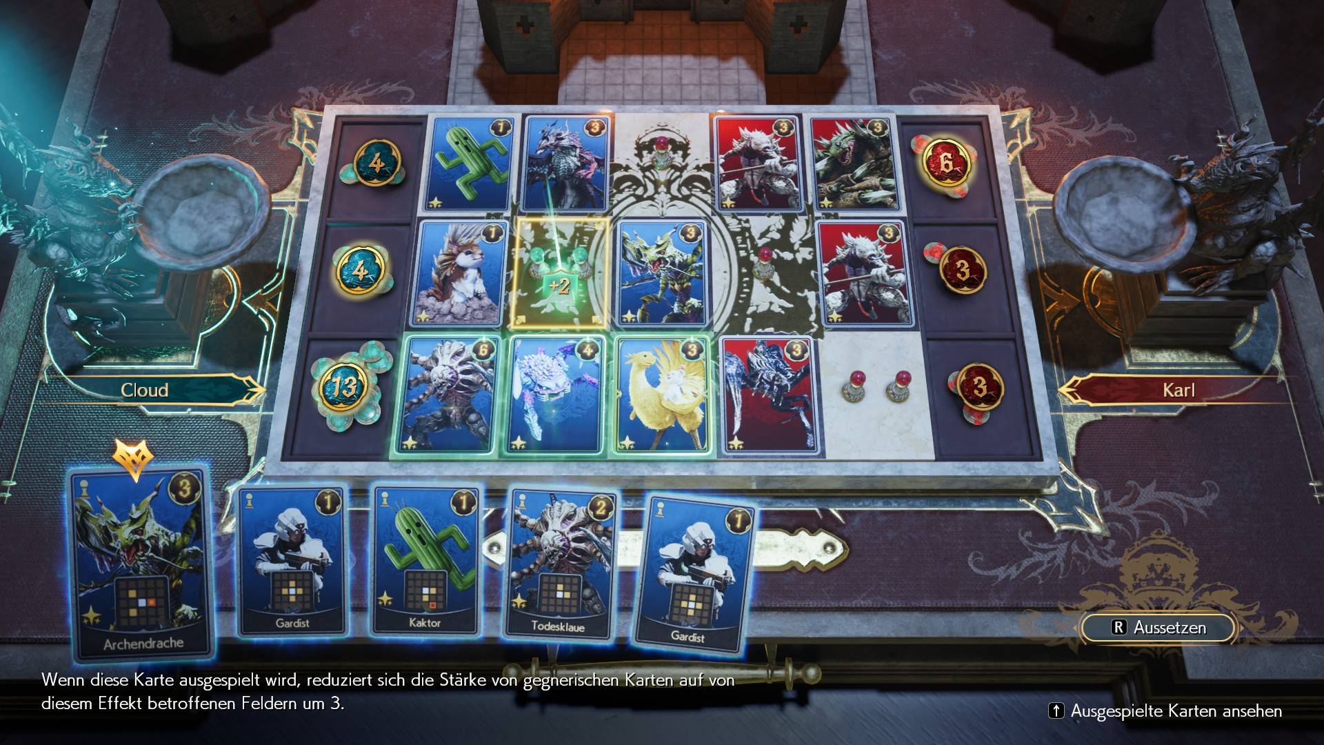 Hier und dort finden sich Dörfler und Einwohner, denen geholfen werden muss, oder gegen die wir ein weiteres Minispiel „Blut der Königin“ spielen können. Das Kartenspiel erinnert in seiner Taktik leicht an Gwent und wurde durch dessen Erfolg sicher zumindest inspiriert.