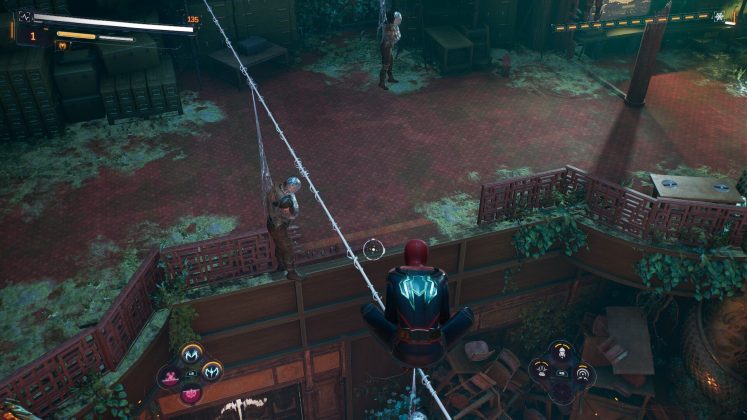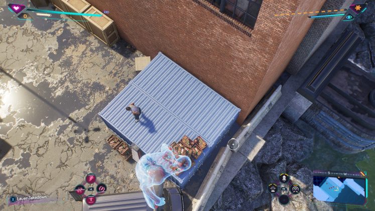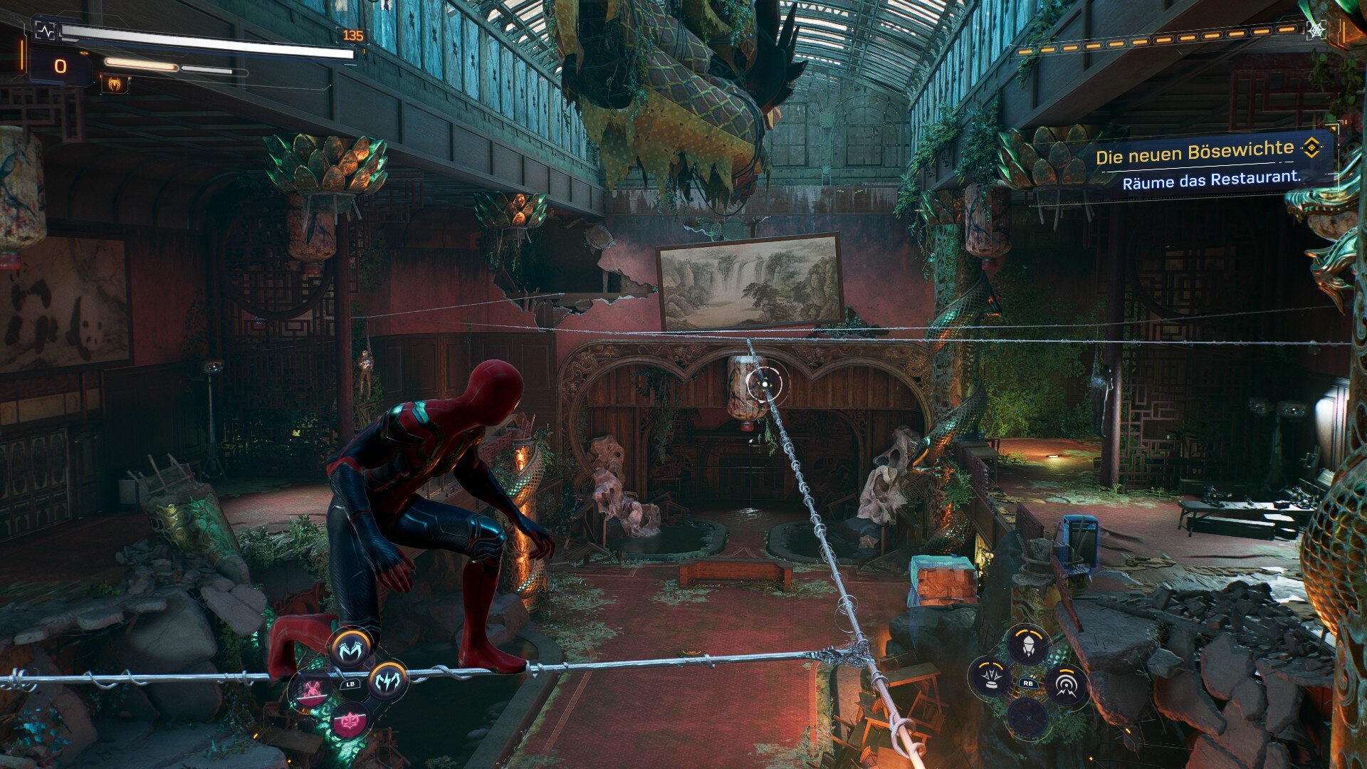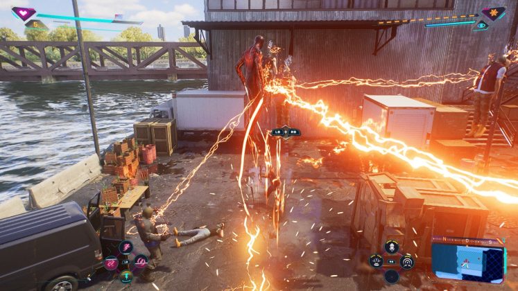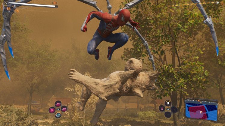 Das bewährte Freeflow-Kampfsystem, das an die „Batman Arkham“-Reihe erinnert, feiert ebenfalls ein Comeback. Spidey teilt Angriffe aus, blockt und kontert in gewohnt dynamischer Manier. Zusätzlich verfügen sowohl Miles als auch Peter über einzigartige Fähigkeiten, die über Talentbäume erweitert werden können. Peter bringt im Kampf vier mechanische Spinnenarme zum Einsatz, inspiriert vom Iron-Spider-Anzug aus den Filmen und Comics. Miles hingegen nutzt seine elektrischen Venom-Angriffe, die jedoch nichts mit dem gleichnamigen Symbionten zu tun haben. Von den freigeschalteten Skills lassen sich bis zu vier ausrüsten und im Kampf einsetzen.