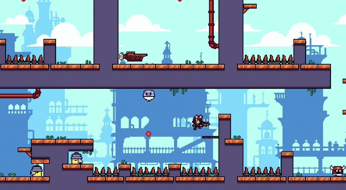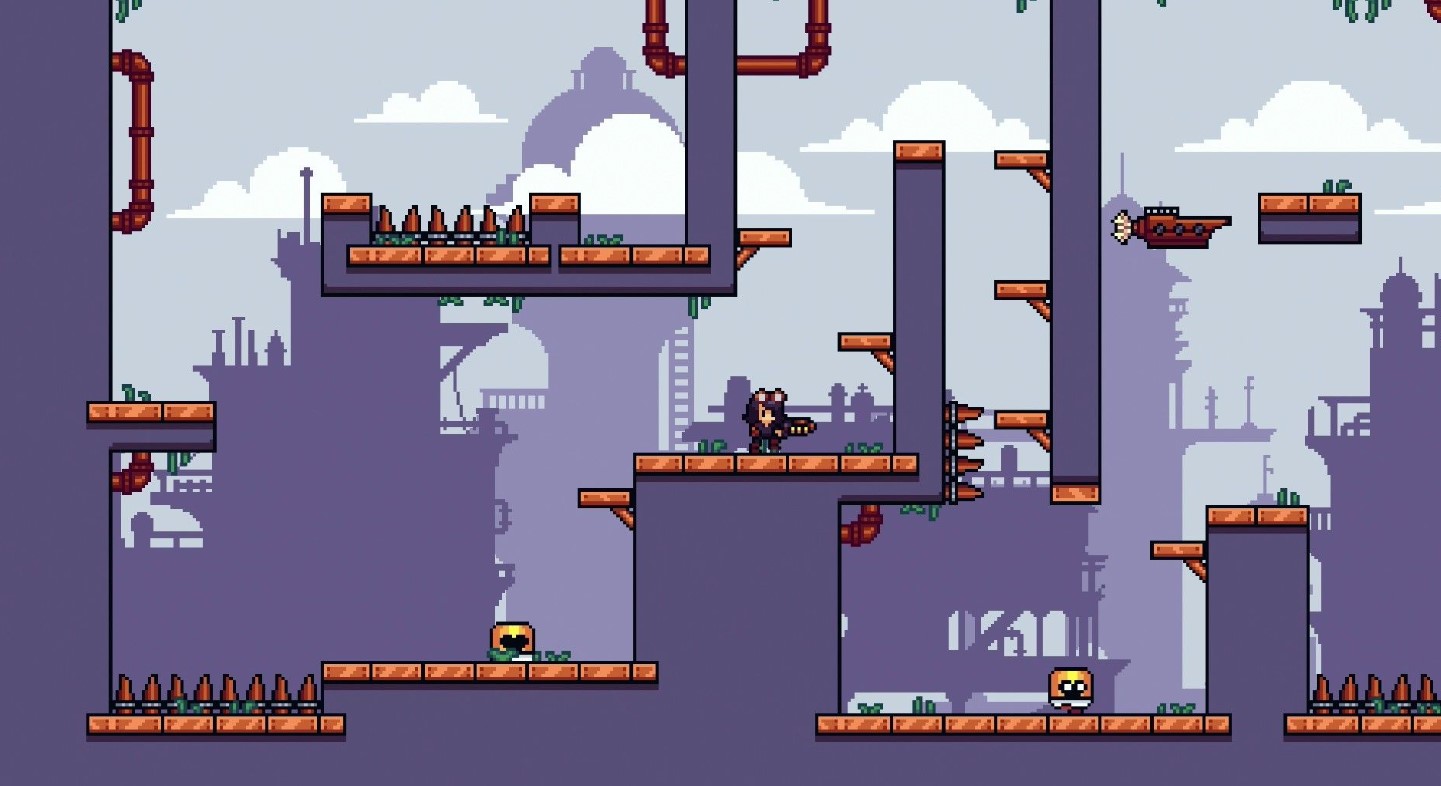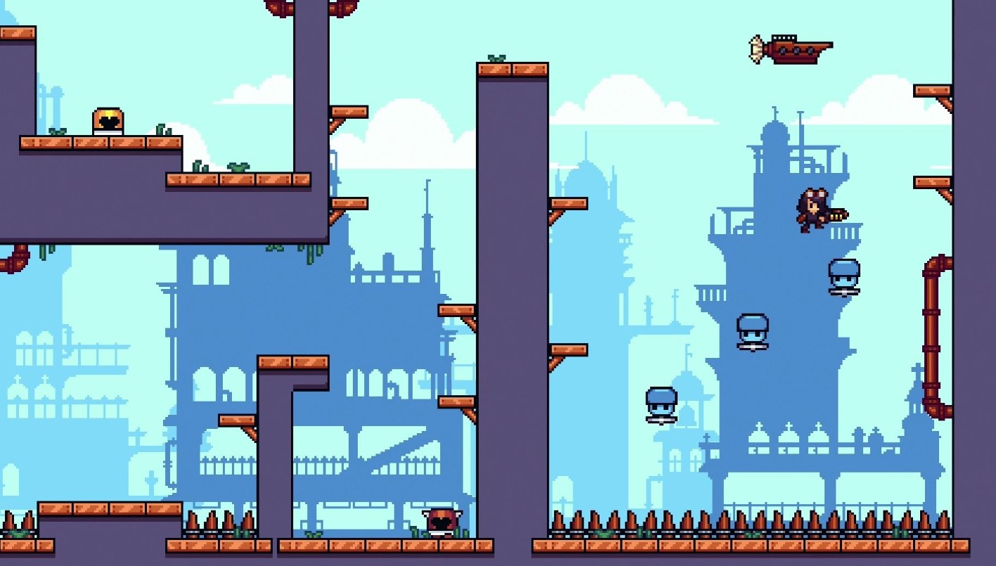 Geboten bekommt Ihr einen niedlichen Platformer mit Retro-Vibes im Steampunk-Look. In erster Linie müsst Ihr jeweils nur den besten Weg zu einem am Ende der Stage wartenden Luftschiff finden. Euch entgegen stehen alle möglichen Umgebungsfallen und auch einige Feinde, die Euch an der Flucht hindern wollen.