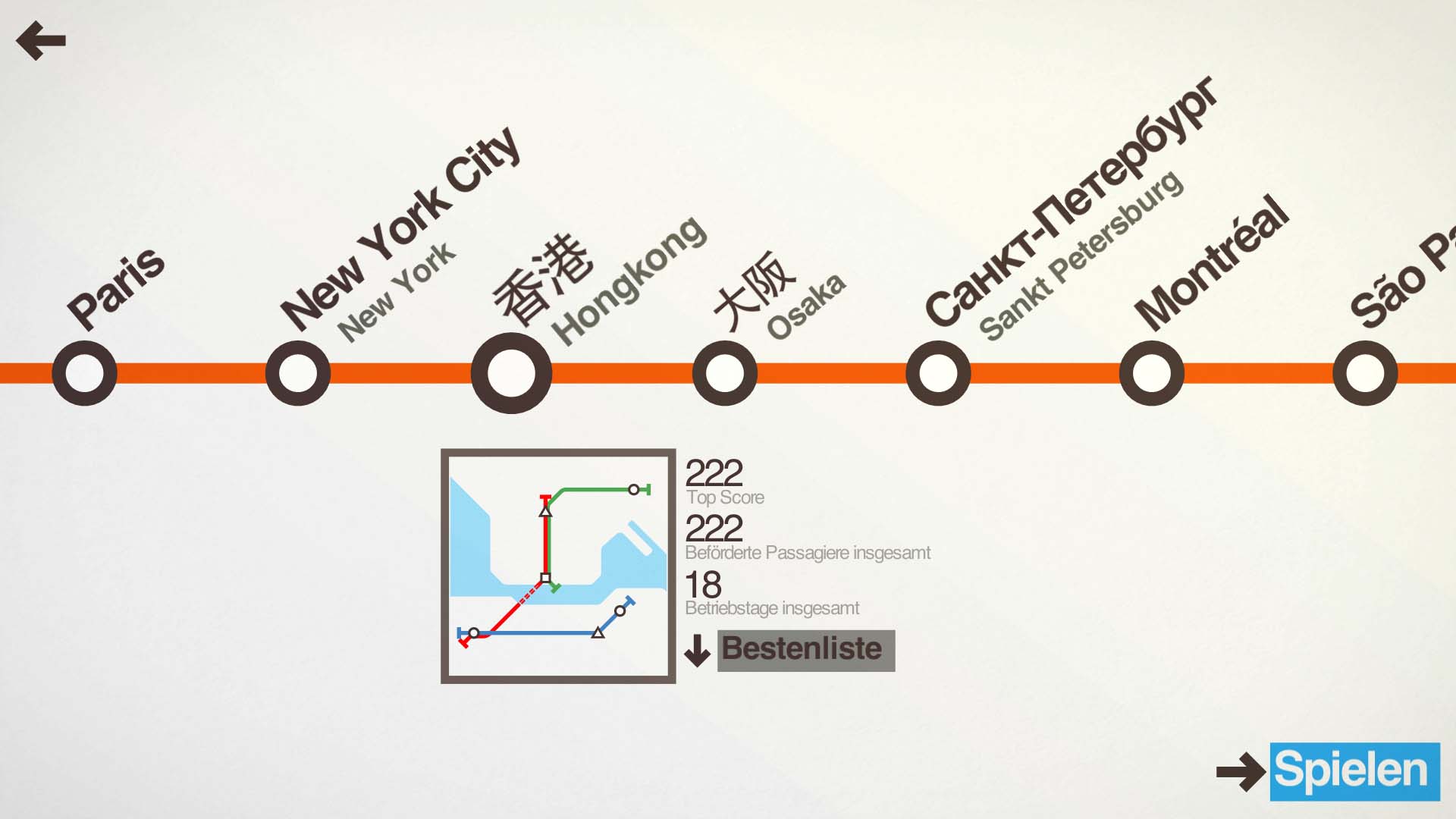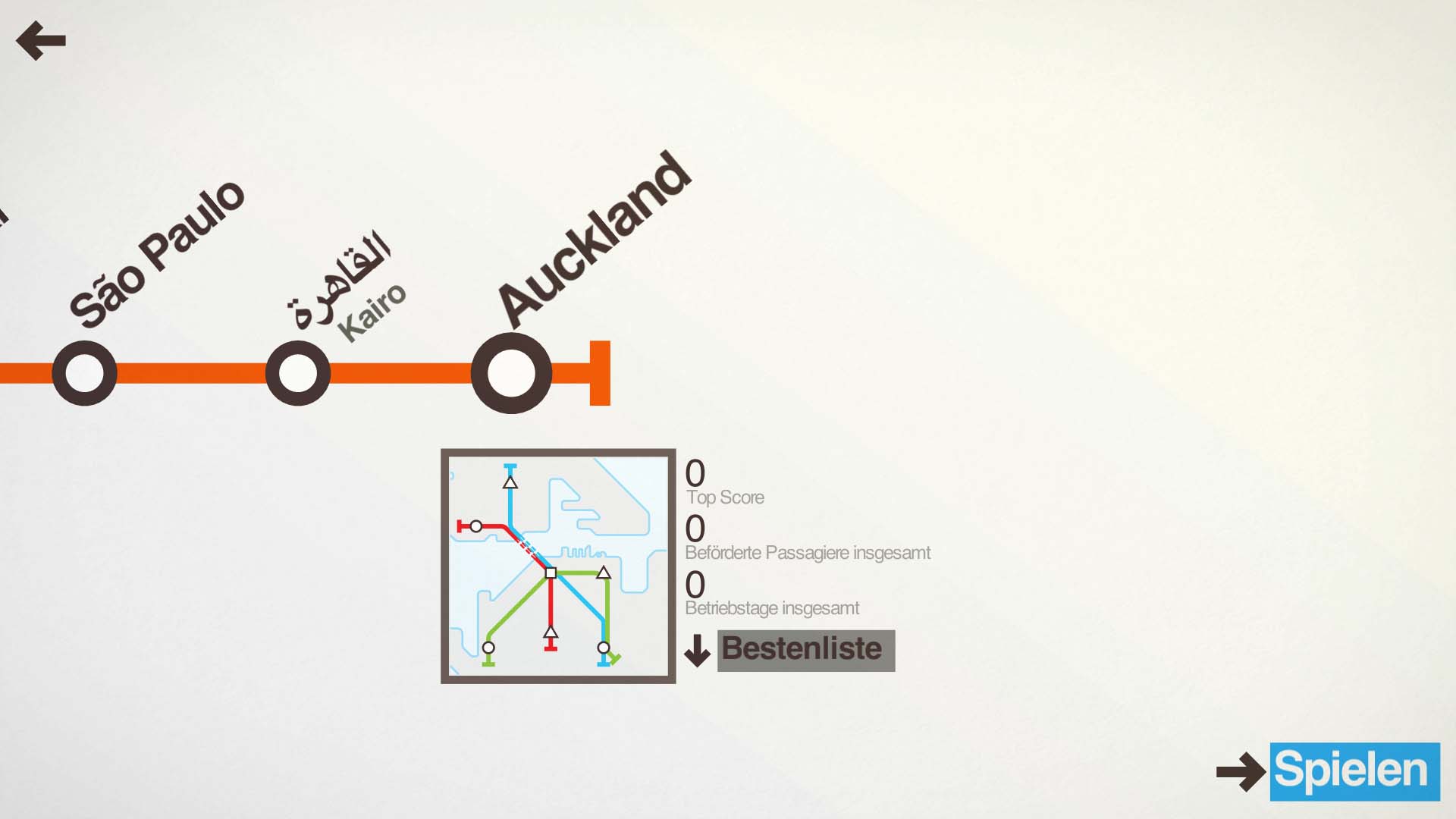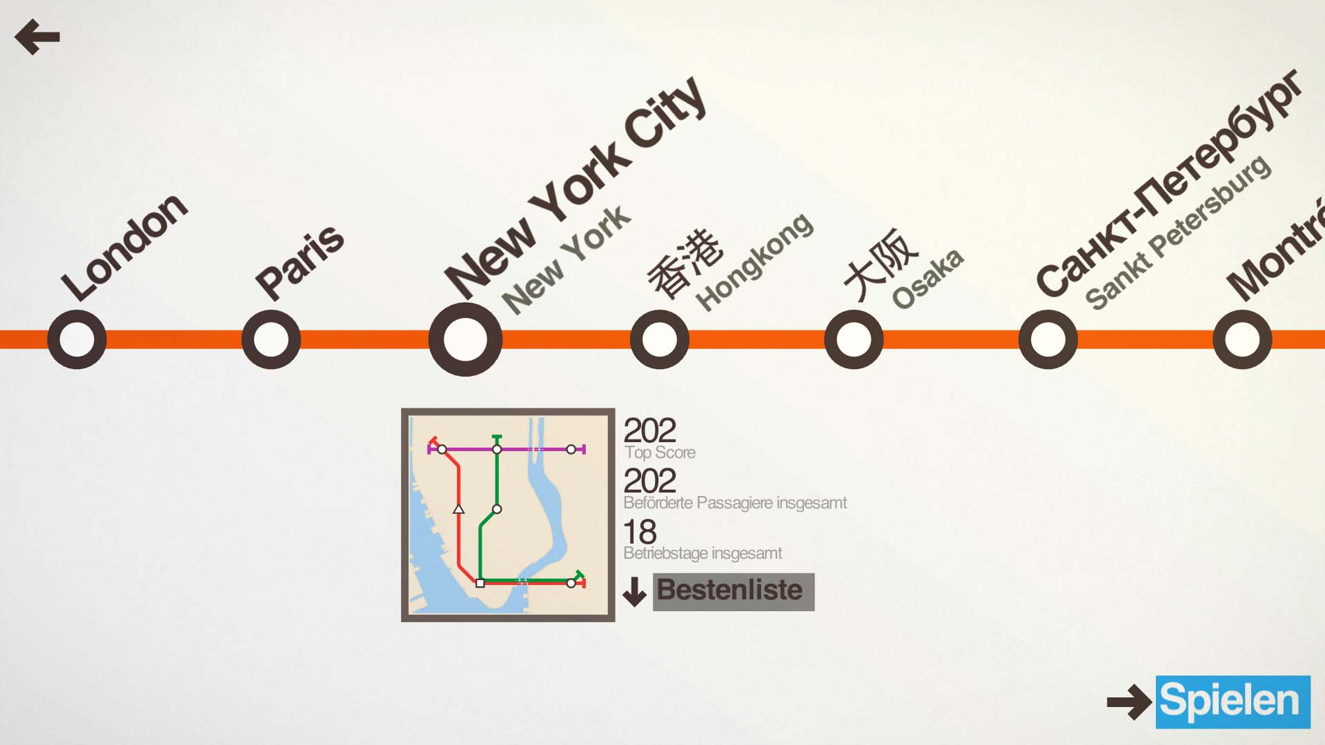 Hier gibt es nicht allzu viel zu sagen, denn im Grunde gibt es keine richtige Story. Der Spieler bekommt mit der Zeit weitere Stationen freigeschalten, die er dann miteinander verbinden muss. Du als zukünftiger Planer hast folgende Städte zur Auswahl:London, Paris, New York City, Hong Kong, Osaka, Sankt Petersburg, Montréal, Sáo Paolo, Kairo und Auckland. Doch neben den Städten hat der zukünftige Linienplaner weitere Features, die ihm zur Verfügung stehen. Er kann zwischen dem Tag- und Nachtmodus wählen und außerdem gibt es in der aktuellen Beta Version bereits 2 Spielmodi, die jedem Käufer zur Verfügung stehen: Es handelt sich um den Pendler und Sorgenfrei Modus. Ein Dritter ist bereits integriert, aber noch nicht freigeschalten. Das wird wohl im Laufe der nächsten Betas geschehen.