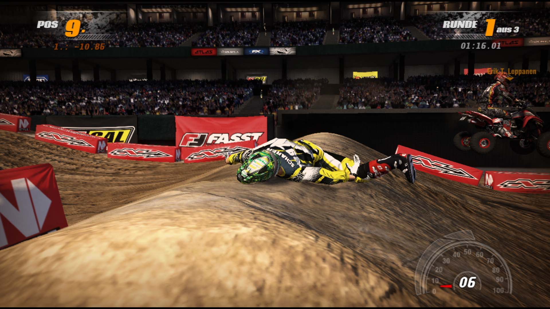 Des Weiteren sollte der Fahrer während Sprüngen und in Kurven auf sein Gleichgewicht achten. Neigt sich das Fahrzeug mit Fahrer zu weit nach vorne oder hinten oder überschlägt sich gar, gibt es einen Unfall, der ebenfalls Zeit kostet. Diese Unfälle können aber auch durch die gegnerische KI oder eure Freunde erzielt werden. Fahrt also schnell, vorsichtig und mit der richtigen Contenance.