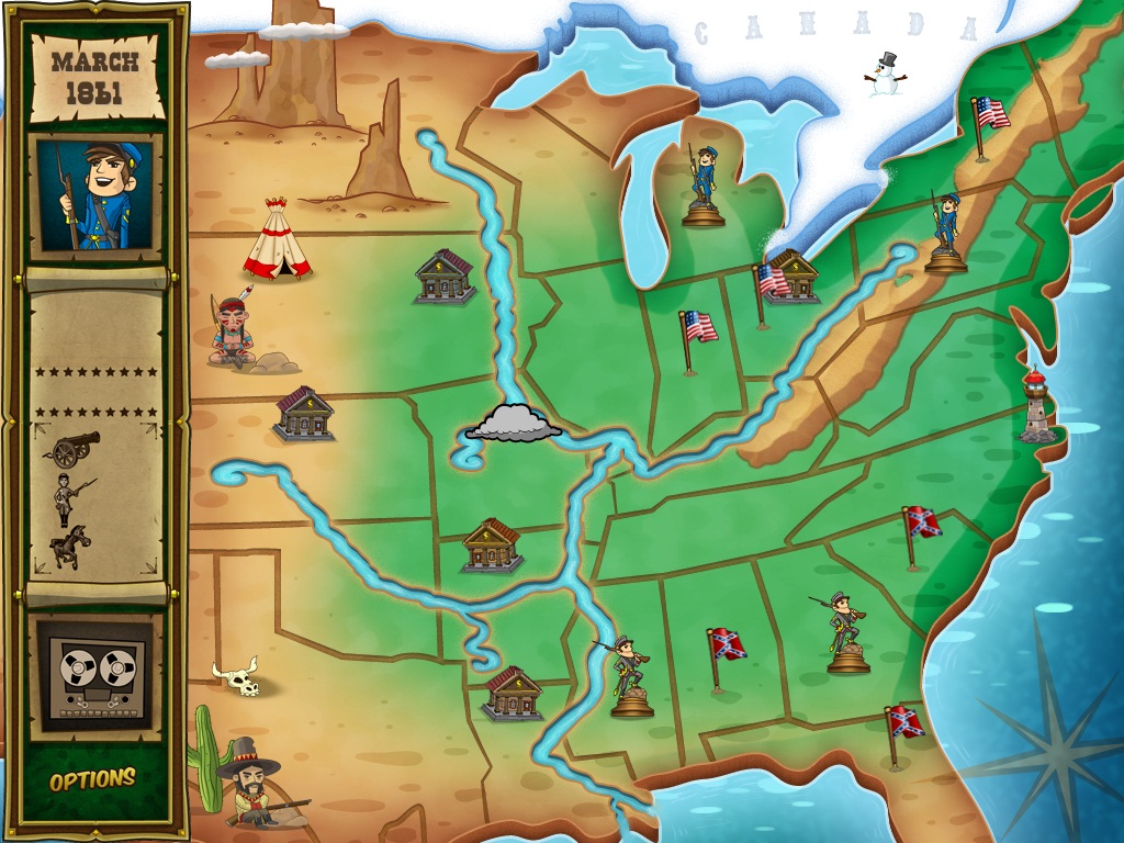 Die zweite Änderung betrifft die Optik. Diese wurde ordentlich aufpoliert und kommt farbenfroh daher. Wermutstropfen für PCler ist die nicht optimierte Darstellung am heimischen Bildschirm. Mit einem 16:9 Bildschirm muss man sich also mit schwarzen Seitenbalken begnügen und North and South in 4:3 genießen, eine Option zur Einstellung der Auflösung fehlt ebenfalls. Hier merkt man sehr deutlich, dass die Optimierung für das iPad Priorität hatte.