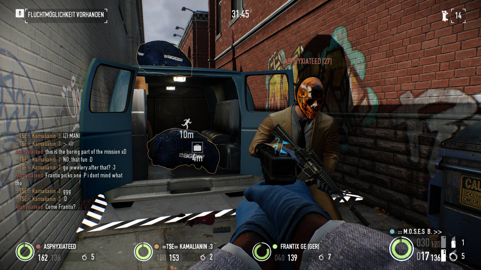 In seinen Grundzügen ist Payday 2 wie schon sein Vorgänger auf rassigen 4-Spieler Koop Action ausgelegt. Wo das Spiel hier seinen Job in vorbildlicher Manier erledigt, hapert es dafür dann aber auch leider etwas im Einzelspielermodus. Wie nicht anders zu erwarten agieren unsere KI-Kumpanen etwas dümmlicher, als wenn wir mit Freunden gemeinsam den Raubzug antreten. So kann es dann auch mehr als einmal passieren, dass einer unserer Schergen an einer Tür „hängen bleibt“ statt hinter ihr in Deckung zu gehen. Noch schlimmer ist es, wenn es sich so völlig blank mitten ins Sperrfeuer begibt und einen auf Rambo macht. Das geht in den seltensten Fällen gut und oft muss man sich, neben dem Verfolgen der Missionsziele, auch noch als kleiner Babysitter seiner Kumpanen bemühen. Zwar fällt dieser Malus nicht zu sehr ins Gewicht, aber es bleibt einfach Tatsache, dass Payday 2 im kooperativen Verbund deutlich mehr Freude macht, als wenn man das Spiel alleine zockt.