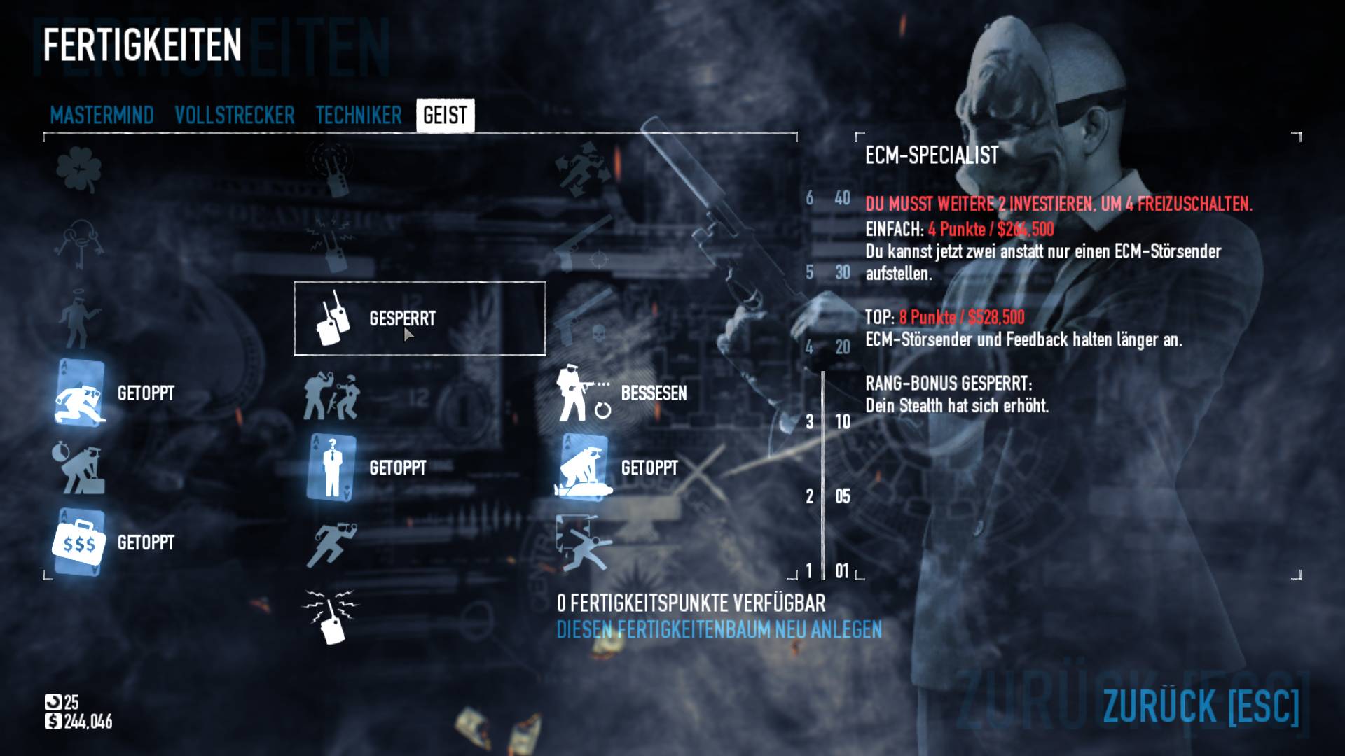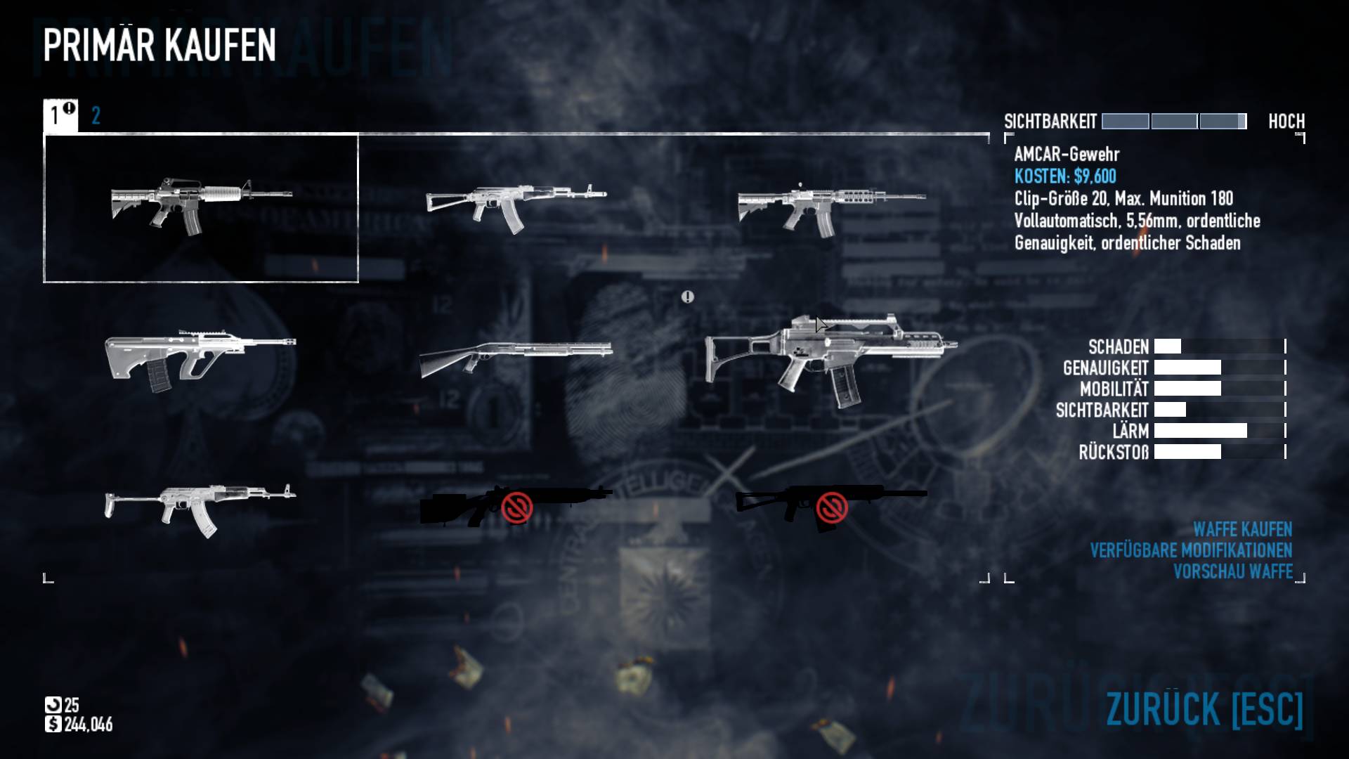 Mit der Beute und ein paar Schrammen geht es abschließend wieder zurück ins Safehouse und hier warten mitunter satte Belohnungen auf uns. Neben neuen freischaltbaren Waffen und Outfits gibt es auch vier Skilltrees, in denen wir unsere Fähigkeitspunkte verteilen können. Dabei steht es uns offen, ob wir unseren Charakter in eine Richtung spezialisieren oder sein Können lieber breit fächern. Die meisten Skills sind passiver Natur und steigern z.B. die Hitpoints oder den geschickten Umgang mit dem Tresorbohrer. Bei den Waffen wird Individualisierung groß geschrieben, die Ballermänner lassen sich in allen erdenklichen Funktionen anpassen. Ob Schalldämpfer, bessere Kolben oder Zielfernrohr, hier bleiben kaum Wünsche offen. Nur sollte man sich angewöhnen, nach jeder Modifikation auch wieder den Weg zum Trainingsraum anzutreten, denn je nach Mod handhabt sich selbst eine gewohnte Waffe mitunter ziemlich neu. Und im wahren Einsatz ist Zielsicherheit absolut überlebenswichtig.