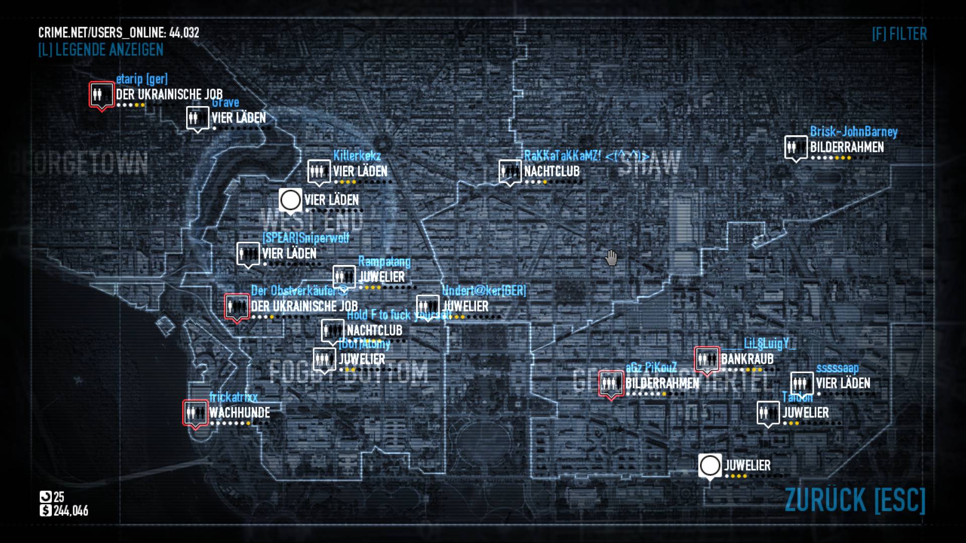 Auf der Karte von Washington D.C. wählen wir frei den nächsten Auftrag