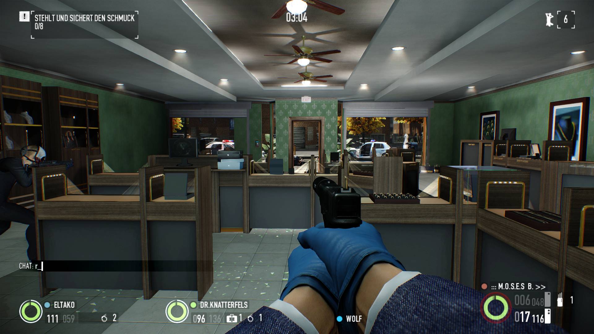 Nun hat man naturgemäß irgendwann auch mal genug von all den Vorbereitungen und will raus auf die Straße und tierisch einen losmachen. Den Entwicklern sei Dank strotzt Payday 2 mit einer Vielzahl an unterschiedlichen Einsätzen, hier darf sich niemand über einstellende Langeweile beklagen. Ganz klassisch verschlägt es uns in eine Bank und wir räumen den üppig gefüllten Tresor leer. An anderer Stelle verschlägt es uns in ein gut besuchtes Shoppingcenter und wir kämpfen uns von Tür zu Tür. Oder wäre nicht auch mal ein abendlicher Raubzug durch einen zwielichtigen Nachtclub eine willkommene Abwechslung? Durch das CrimeNET Feature sind die Aufträge in einer Art eigener Dynamik angelegt. So kann es dann auch schon einmal passieren, dass Missionsziele angepasst werden oder wir einen Feldzug erst am nächsten Tag fortsetzen sollen. Das sieht dann beispielsweise so aus, dass wir an Tag 1 in einem Museum diverse Kunstwerke stehlen sollen und diese dann an Tag 2 an einem geheimen Ort übergeben sollen – inklusive diverse Zwischenfälle natürlich. Neben der gewohnten Packung Humor, der teilweise schon derbe Züge hat, machen kleinere Anspielungen richtig viel Laune. Oder gibt es jemanden, der sich beim Auftrag rund um die Designerdroge Crystal Meth nicht an die TV-Serie Breaking Bad erinnert fühlt.