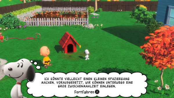 Die Spielwelt ist natürlich größer als nur Snoopys Haus, es spielt in einem Teil der Heimatstadt der Peanuts. Wir können uns hier frei bewegen und finden in der Welt verteilt unsere Freunde und die Hinweise für die Rätsel. Über Bushaltestellen kann man auch mittels Schnellreise beschleunigt von A nach B kommen.