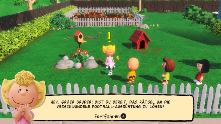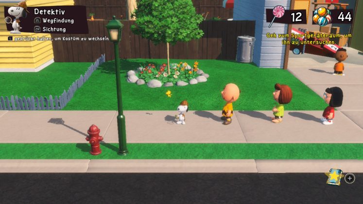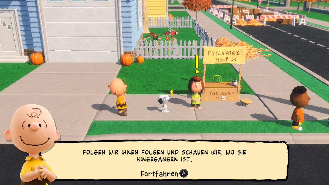 Die Spielwelt ist natürlich größer als nur Snoopys Haus, es spielt in einem Teil der Heimatstadt der Peanuts. Wir können uns hier frei bewegen und finden in der Welt verteilt unsere Freunde und die Hinweise für die Rätsel. Über Bushaltestellen kann man auch mittels Schnellreise beschleunigt von A nach B kommen.