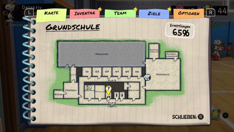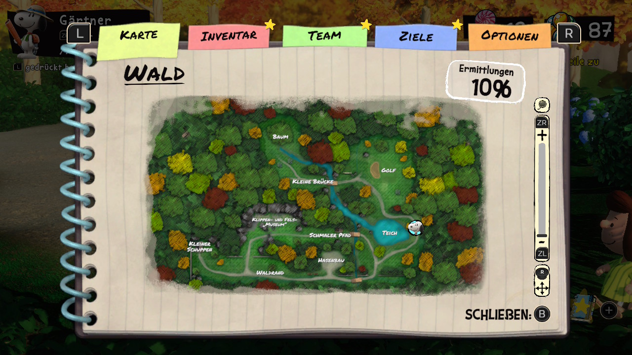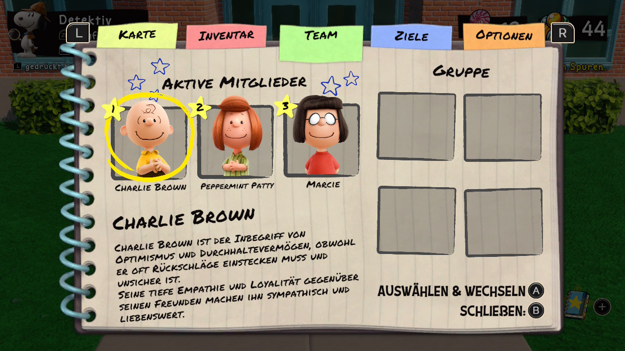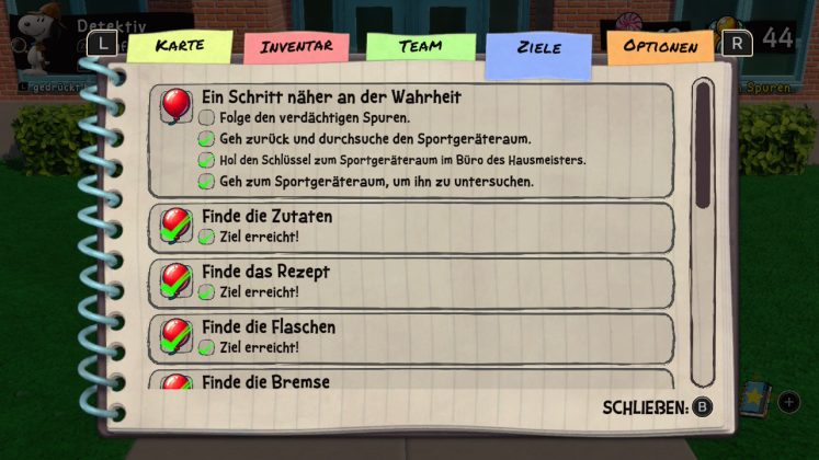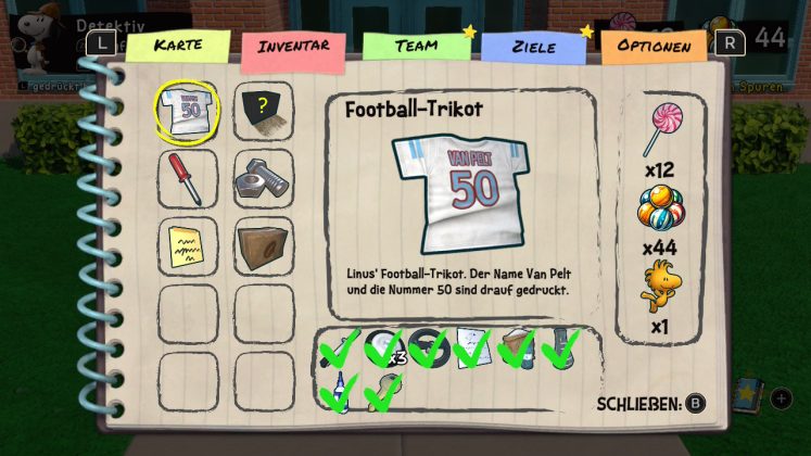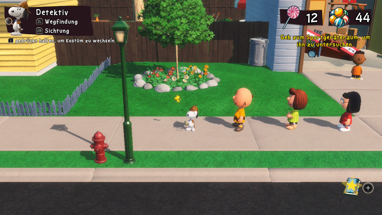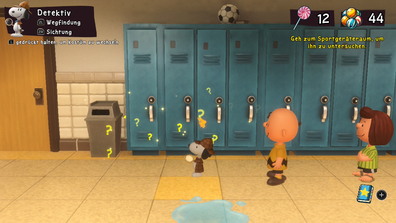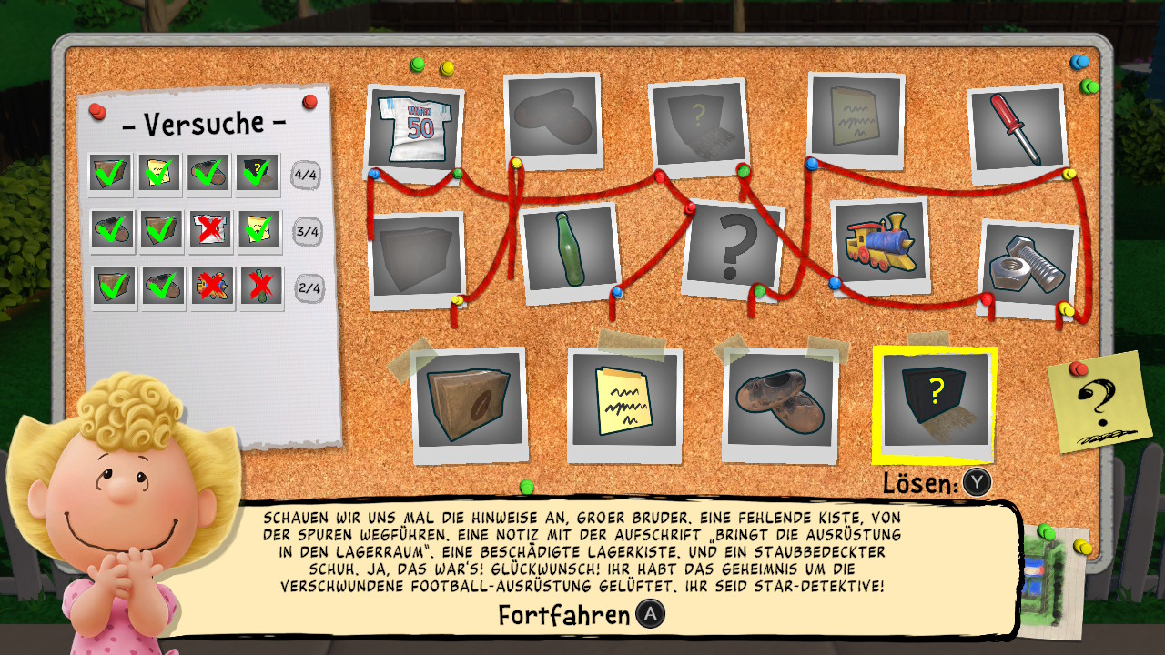 Wenn man alle Hinweise gesammelt hat, kann man zu Charlie Browns Schwester Lucy gehen und den Fall lösen. Hierfür hat man drei Versuche. Hat man den Fall dann noch nicht gelöst, kann man sich weitere Versuche mit Lutschern kaufen, die man im Rahmen der Minispiele sammeln kann. Ergänzende Hinweise kann man von Linus erhalten, doch auch er macht das nicht umsonst, er möchte Murmeln von uns, die wir offensichtlich oder auch versteckt in der Spielwelt finden. Sowohl Murmeln als auch Lutscher findet man in recht großer Zahl, sodass es hier bei Bedarf eine gute Hilfestellung gibt.