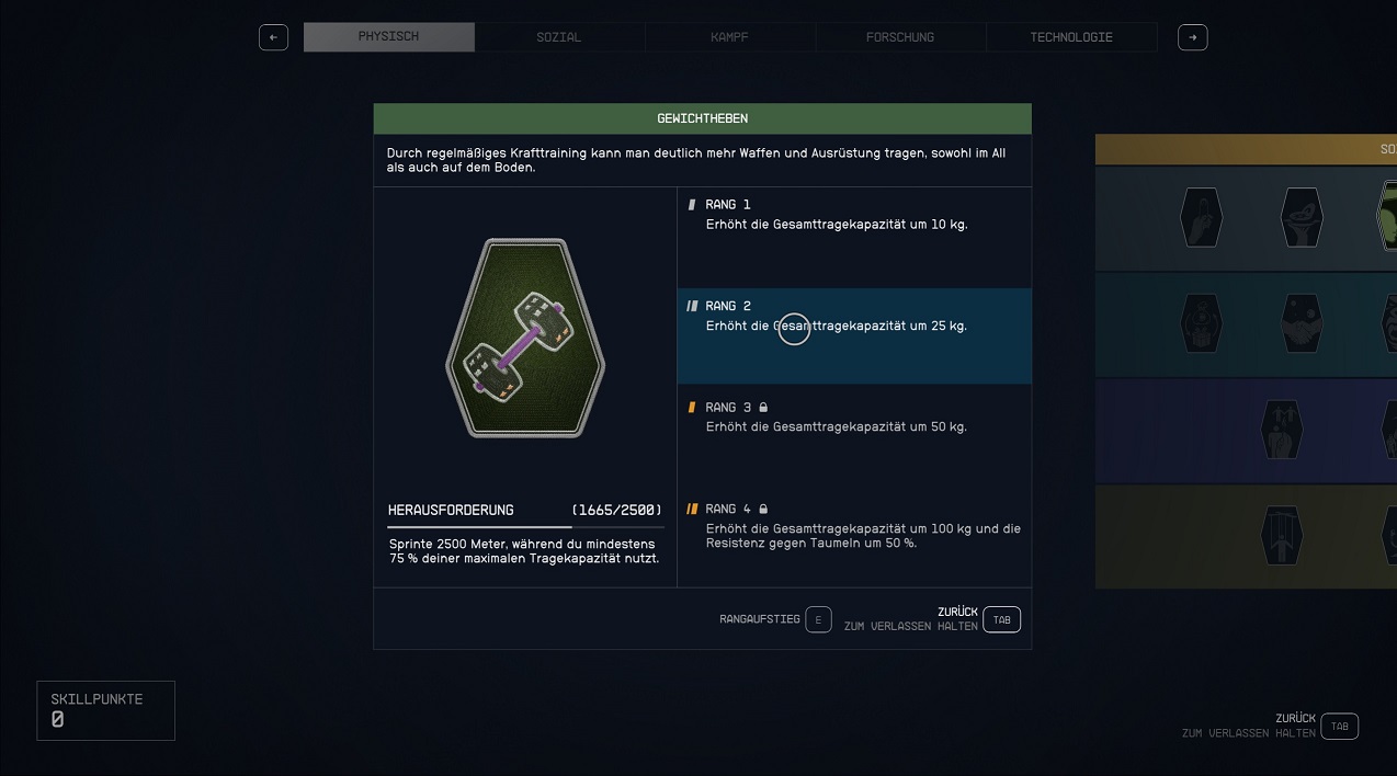 Damit das Ganze aber nicht zu einfach wird, hat Bethesda einen Trick eingebaut: Wollt ihr die nächsthöhere Stufe eines Talents erreichen, müsst ihr dafür eine bestimmte Voraussetzung erfüllen. Bei Waffen ist das meist einfach: x Gegner töten für die nächste Stufe. Bei einigen anderen Talenten ist es kniffliger. Beispiel „Gewichtheben“, mit dem ihr eure Tragkraft erhöhen könnt: Um hier Level 2 freizuschalten, müsst ihr 2500 Meter mit mindestens 75 Prozent eurer Tragkraft sprinten. Da kommt man schnell aus der Puste.