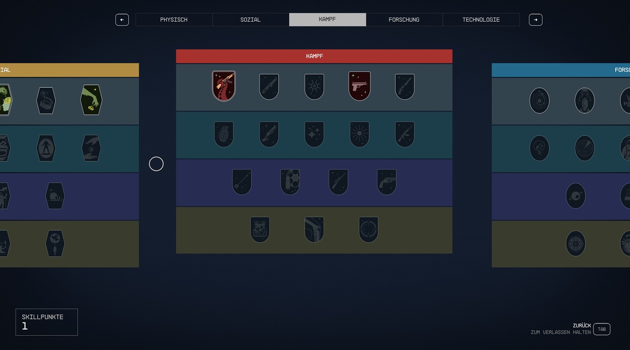 Im Spiel selbst kann man seinen Charakter natürlich weiterentwickeln. Hier ist Starfield ganz RPG. Das Talente-System ist ebenso übersichtlich wie einfach gehalten. Es gibt die fünf Kategorien Physisch, Sozial, Kampf, Forschung und Technologie. Darunter sind die Talente in vier Stufen eingeteilt. Steigt der Charakter im Level auf, kann man einen Fähigkeitspunkt für ein Talent ausgeben.