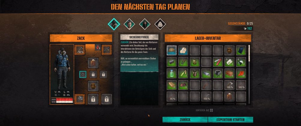 Im Einsatz können wir bis zu drei Charaktere aus unserer Gruppe mitnehmen. Allerdings können nicht alle außerhalb des Lagers eingesetzt werden. Vor dem Start einer Mission können wir dann noch das Equipment anpassen und auffüllen. Unsere Charaktere können Waffen, Werkzeuge, Schutzkleidung, Taschen und weiteres Equipment tragen. Darüber hinaus gibt es einen gruppenübergreifenden Rucksack, in dem später alles landet, was wir sammeln.