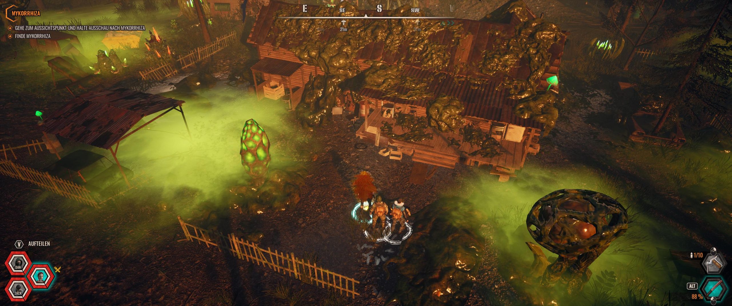 Uns erwartet die gefährliche Welt von Survive the Fall. Neben einer Hauptquestreihe gibt es noch verschiedene kleine Nebenaufträge zu erledigen, die allerdings nicht alle als eigenständige, verfolgbare Quest erscheinen. Während der Erkundungsmission können wir nicht nur Aufgaben erledigen, sondern müssen auch Ressourcen sammeln und natürlich erstmal die Karte erkunden. An verschiedenen Stellen gibt es Schnellreisepunkte, sodass wir uns sinnloses Herumlaufen ersparen können. Neben gefährlichen Tieren können wir auch auf unsere Feinde treffen, was einen Kampf erforderliche machen kann. Solange wir umsichtig unterwegs sind, haben wir aber in der Regel die Wahl zwischen einem direkten, offenen Gefecht oder dem Versuch unsere Feinde unauffällig auszuschalten und so auch zu umgehen. Das Kampfsystem ist sehr direkt, wir können aber eine sogenannte taktische Pause aktivieren, in der wir nicht nur in Ruhe die Situation auswerten können, sondern auch wie bei einem rundenbasierten Kampfsystem einzelne Angriffe/Aufgaben zuordnen können, die dann ausgeführt werden. Letzteres ist besonders für verdeckte Operationen interessant, um so unseren Kameraden einzelne Aktionen zuzuweisen, wenn man mehrere Gegner gleichzeitig eliminieren möchte. Im Kampf müssen wir die Verwundung unserer Charaktere im Auge behalten. Wird jemand aus unserem Team ausgeschaltet, können wir denjenigen in einem gewissen Zeitrahmen wiederbeleben.