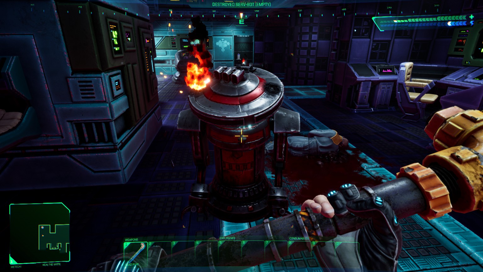 Die Station erkunden wir dabei klassisch in der Egoperspektive. In den ersten Minuten zeigt das Spiel mittels kleiner Tool-Tipps wie die wichtigsten Mechaniken, wie Heilen, Rätsel und andere Gegenstände fuktionieren und schon bald findet man seine erste Waffe – ein Metallrohr. Und schon kann das fröhliche Mutantengekloppe losgehen. Im Laufe des Spiels dringen wir immer tiefer in die Raumstation ein, finden Geheimnisse, Waffen und Upgrades und werden so langsam von einem Unscheinbaren Hacker zu einer bis an die Zähne bewaffneten Killermaschine.