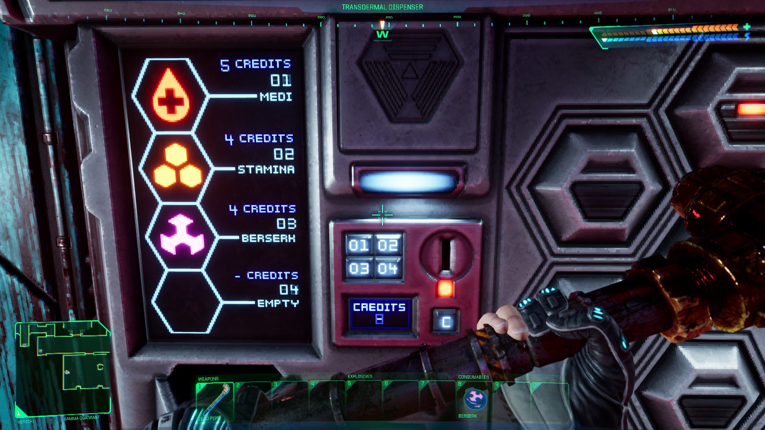 Einen Questmarker oder dergleichen gibt es nicht, stattdessen können wir die verwinkelten Gänge und Schächte frei erkunden. Zwischendurch finden wir Zugangskarten und Codes die uns bislang verschlossene Areale öffnen lassen. System Shock befriedigt außerdem den inneren Kleptomanen, denn so gut wie jeder Gegenstand den ihr in der Welt seht kann mitgenommen werden, um diesen entweder zu Scraps zu verarbeiten oder um ihn an speziellen Stationen gegen Credits einzutauschen. Mit diesen Credits lassen sich widerrum Gegenstände und Upgrades an Automaten erwerben. Die Entwickler sind dem Gameplay des originals Treu geblieben, haben aber hier und da einige Verbesserungen und Extras eingefügt, so können wir etwa das Apartment, welches man zu Beginn des Orginals in einer Zwischensequenz sah, frei erkunden. Abseits davon können sich Spieler außerdem auf neue Gegnertypen, ein neues Hacking System und eine neue Zerstückelungsmechanik freuen.