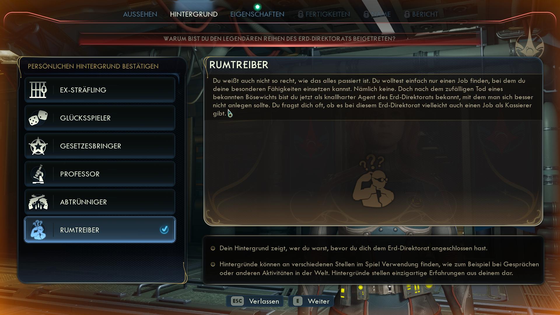 Bevor es jedoch losgeht, steht zunächst die Erstellung unseres Charakters an. Hier zeigt Obsidian Entertainment echte Rollenspiel-Erfahrung. Abseits der typischen optischen Anpassungsmöglichkeiten von Geschlecht und Aussehen, könnt ihr auch den Hintergrund eures Commanders bestimmen. Zur Auswahl stehen hier sechs verschiedene Backgrounds, die bestimmen wie euer Charakter zum Erd-Direktorat gekommen ist: