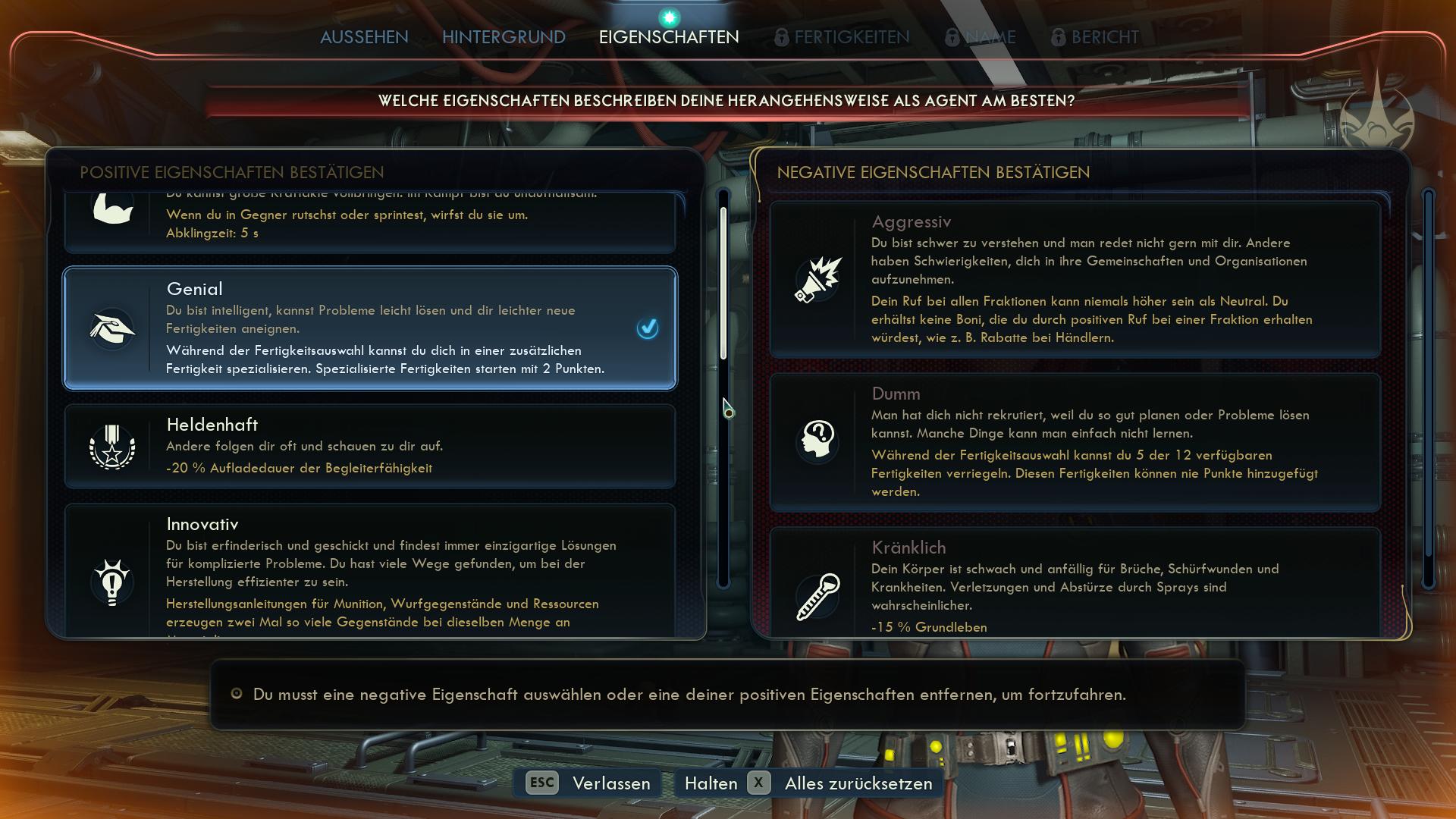 Es besteht auch die Möglichkeit sich eine weitere positive Eigenschaft anzueignen, jedoch müssen Spieler dann auch eine negative bestimmen. In unserem Fall haben wir etwa neben „Genial“ auch „Glückspilz“ gewählt, was unsere Kritische Chance erhöht hat und uns nicht näher genannte Gelegenheiten offenbaren soll. Im Gegenzug haben wir dem Commander die negative Eigenschaft „Kränklich“ verpasst, die unseren Grundschaden und unsere Fähigkeit, Giften zu widerstehen, verringert. Insgesamt 90 Merkmale stehen dabei zur Auswahl, die entweder nützlich sind oder euch das Leben auf Arcadia sehr erschweren können.