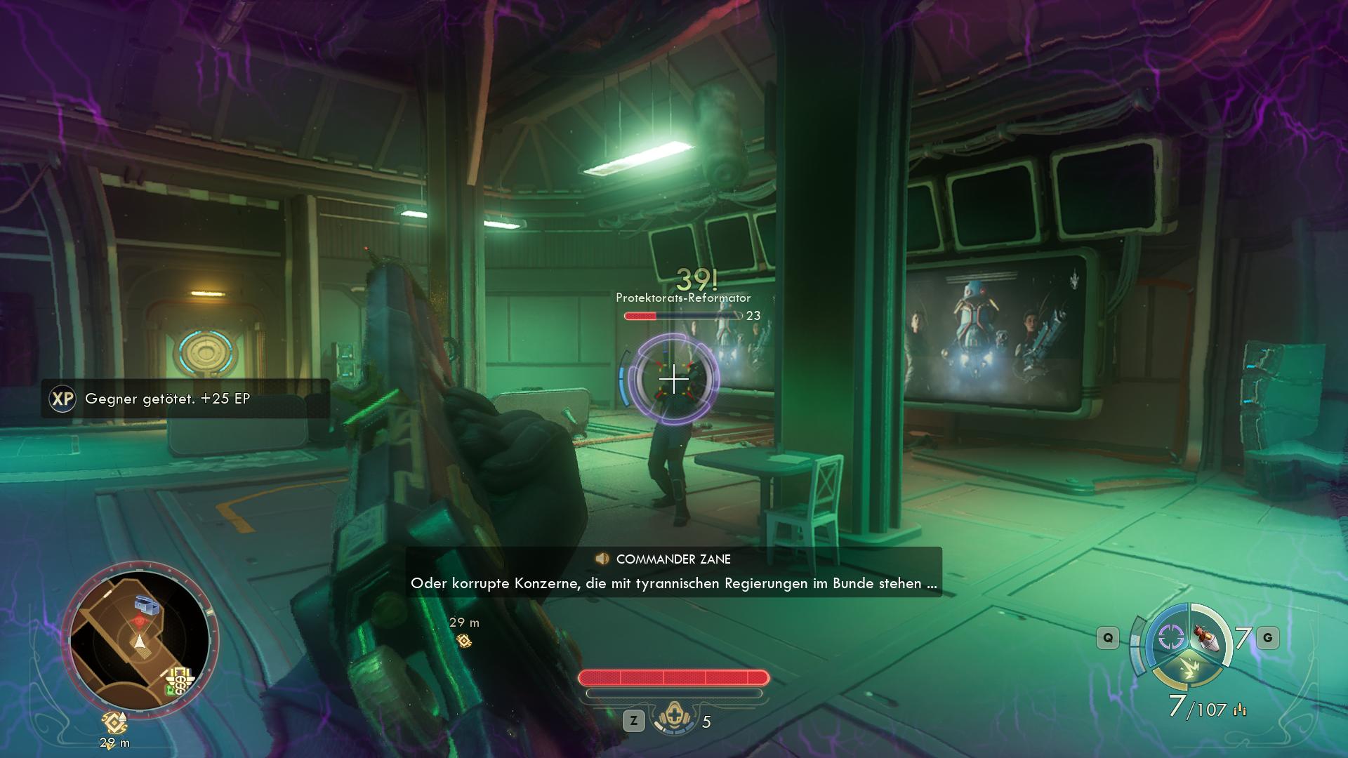 Kommt es im Laufe der Quests oder während zufälliger Begegnungen zum Kampf, kann euer Commander neben einer Auswahl an Waffen auch besondere Skills nutzen. Zu Beginn steht Spielern das taktische Zeitdilatationsgerät zur Verfügung, welches wie der Name vermuten lässt, die Zeit kurz verlangsamt und uns so einen kleinen Vorteil verschafft. Daneben verfügt The Outer Worlds 2 auch über eine moderne Bewegungssteuerung, wie sie etwa in Shootern zu finden ist. Bei Bedarf können wir im Gefecht Sprinten, in Deckung gehen oder Rutschbewegungen vollführen.