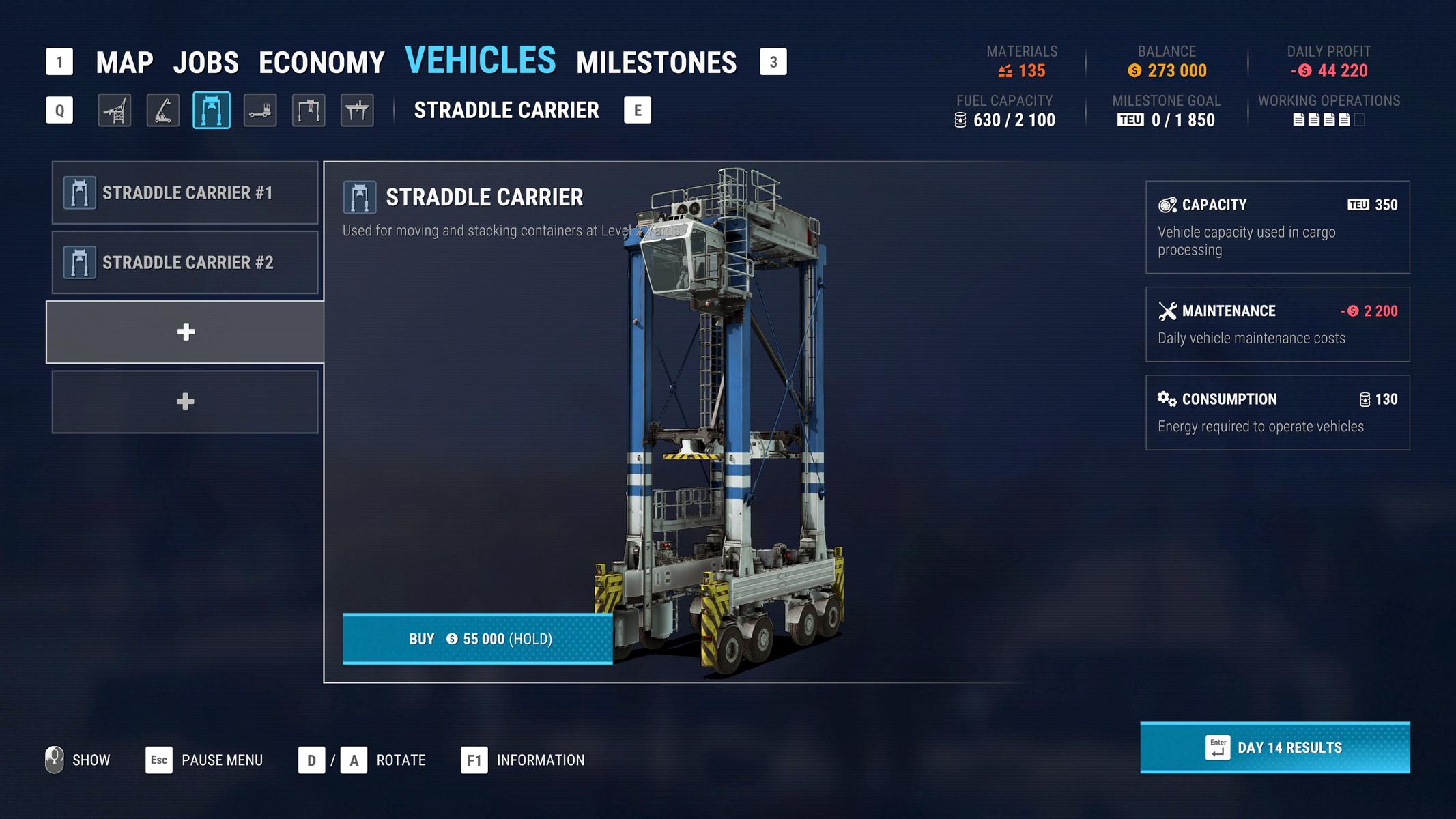 Die tägliche Kapazität unserer Terminals ist genau so begrenzt, wie die Anzahl an Jobs, die wir erledigen können. Doch wir haben natürlich auch jeden Tag laufende Kosten für unseren Hafen und unsere Fahrzeuge. Daher ist es wichtig, dass wir bis zum Tagesabschluss, den wir manuell vorgeben, genügend Jobs und Aufträge erledigen, damit wir Geld für weitere Expansionen verdienen. Dabei muss man durchaus strategisch planen.